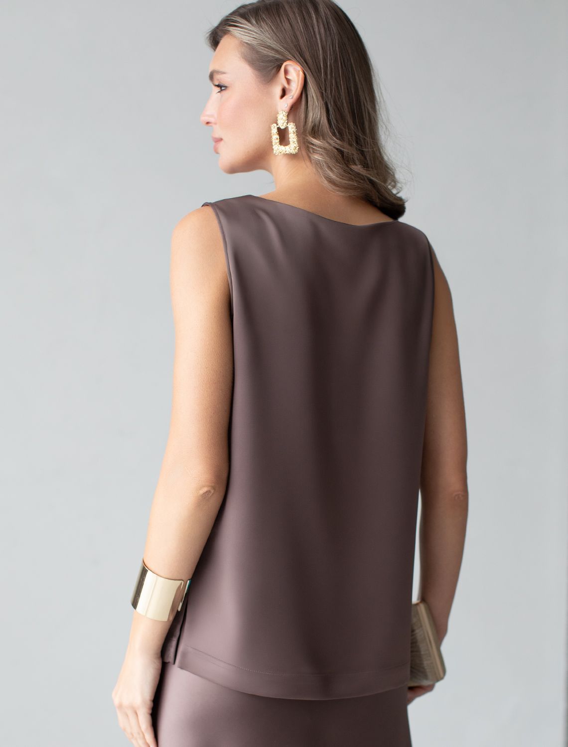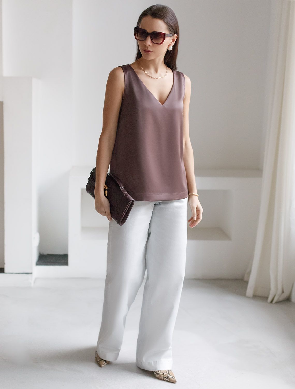 Этот топ идеально подойдет для создания стильного ансамбля на вечерние мероприятия или важные события. Благодаря сочетанию элегантности и практичности, такая стильная блузка без рукавов станет незаменимой частью гардероба для женщин, которые ценят качество и комфорт в одежде. Благородный блеск сатина добавляет нотку роскоши в повседневный гардероб и гармонично сочетается с разными стилями одежды: офисными брюками, джинсами или юбками. V-образный вырез визуально вытягивает шею и создает элегантный акцент в зоне декольте, делая образ более открытым и современным.