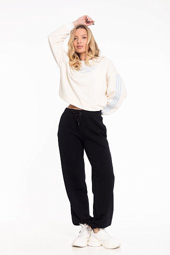 Женские брюки из однотонного футера «воздушка» — удобная и стильная основа для повседневных образов. Модель выполнена с притачным поясом, в который вставлена резинка, и оснащена шнуром, продетым через петли для дополнительной регулировки посадки. В боковых швах расположены функциональные карманы, а низ брюк собран на резинку, что придаёт образу аккуратный и современный вид.