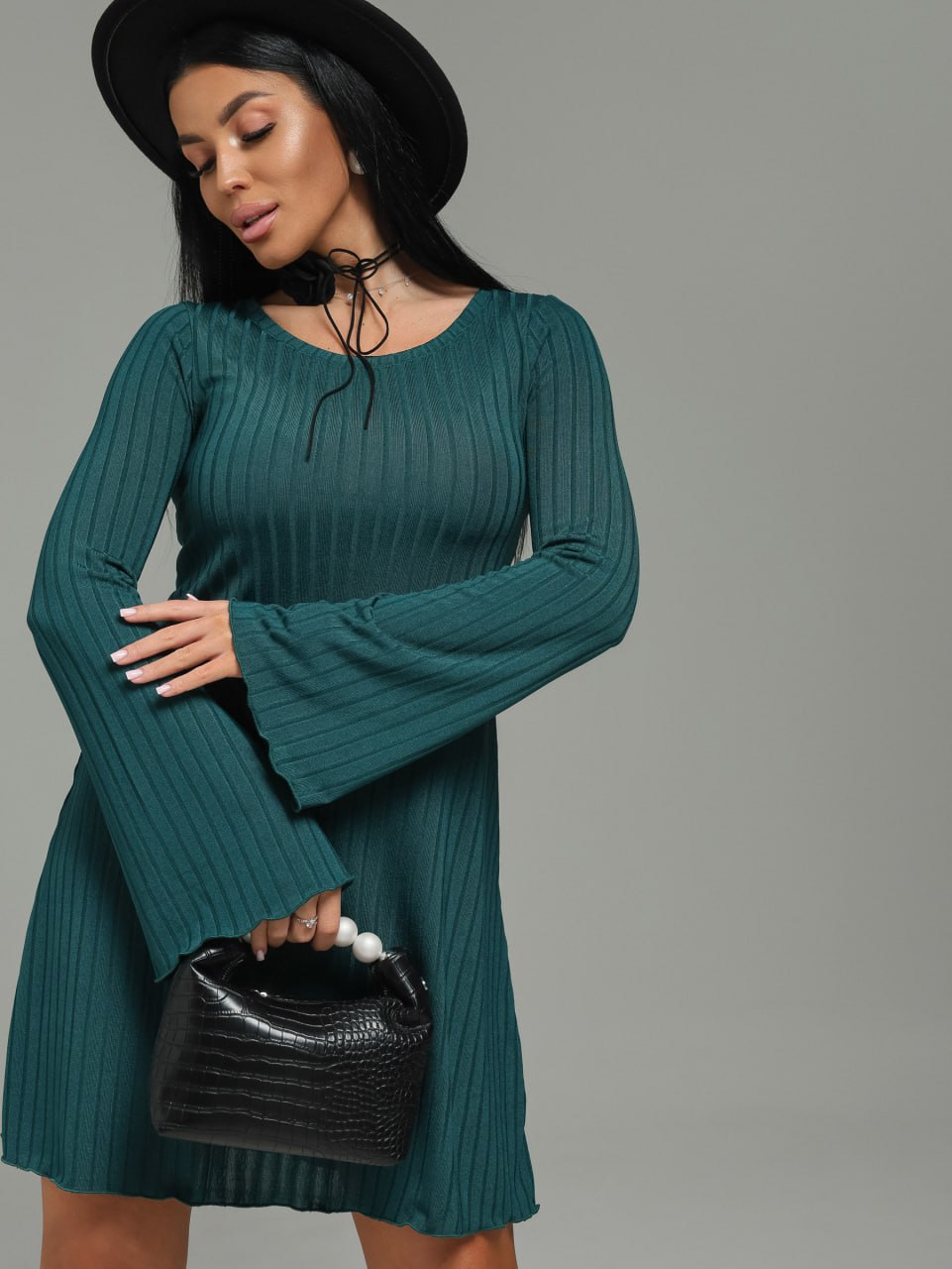 Платье из лапши с широким рубчиком, приталенное с длинным, втачным, расклешенным к низу рукавом.