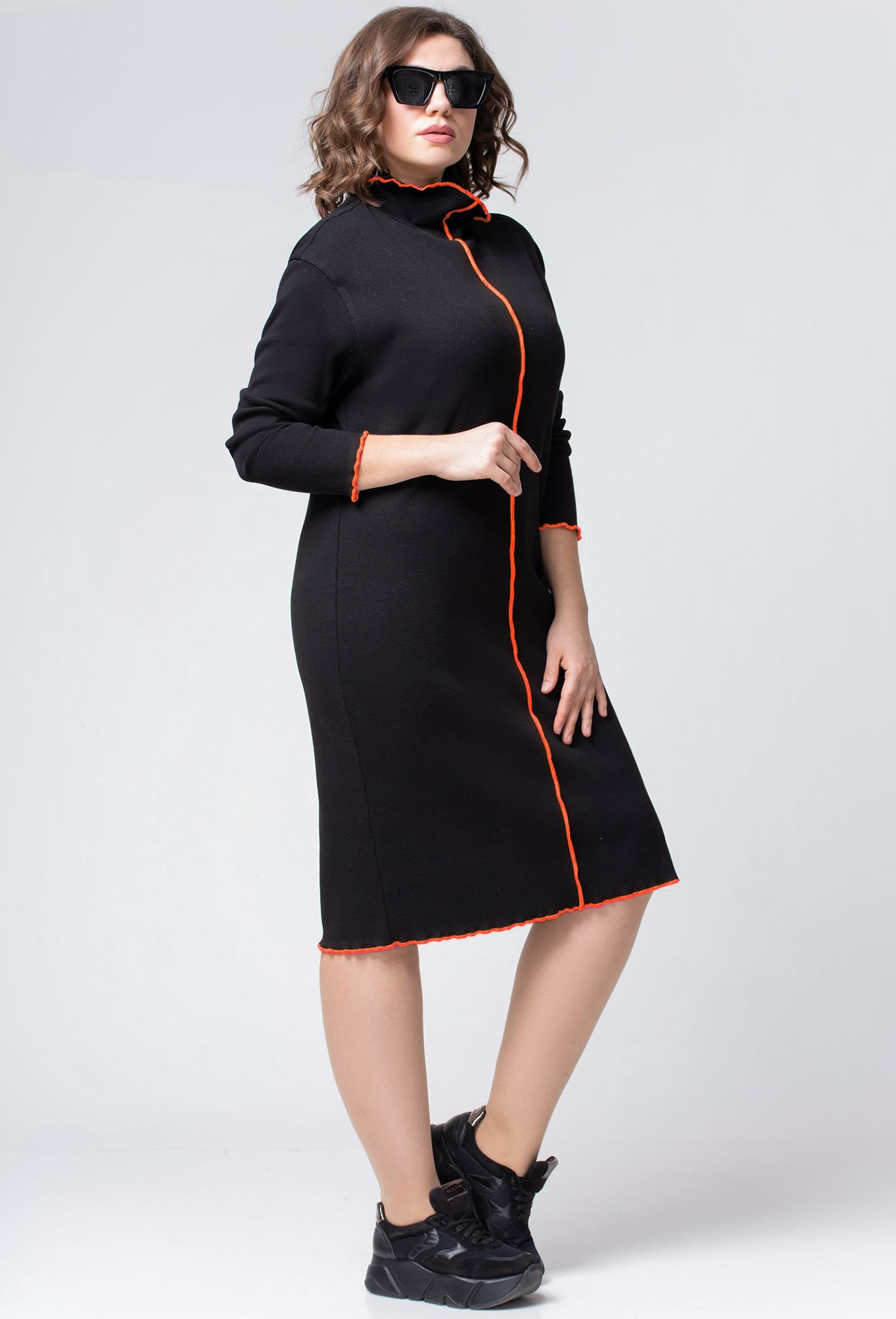 Платье женское из трикотажного полотна в виде английской резинки со спущенным плечевым швом, ворот-гольф. Платье с отделочными контрастными строчками. Слева в боковом шве молния. Внизу дизайнерская нашивка.