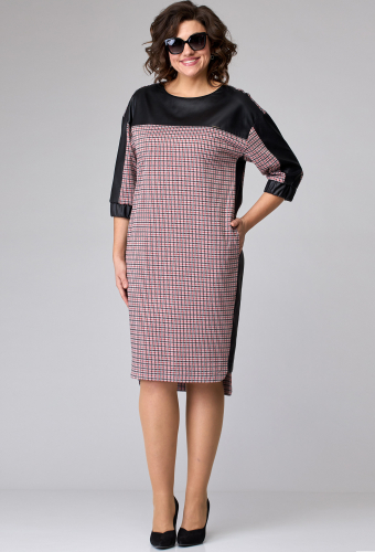 Платье женское повседневное полуприлегающего силуэта выполнено из трикотажного полотна 2х дизайнов и отделки из трикотажной сетки. Вырез горловины круглый, обработан по полочке руликом, по спинке обтачкой. Рукав втачной 3/4 со складками по пройме. По спинке потайная тесьма молния и разрез. Декором платья служат отделочные детали из сетки.