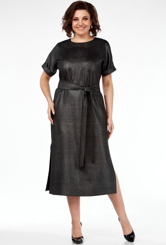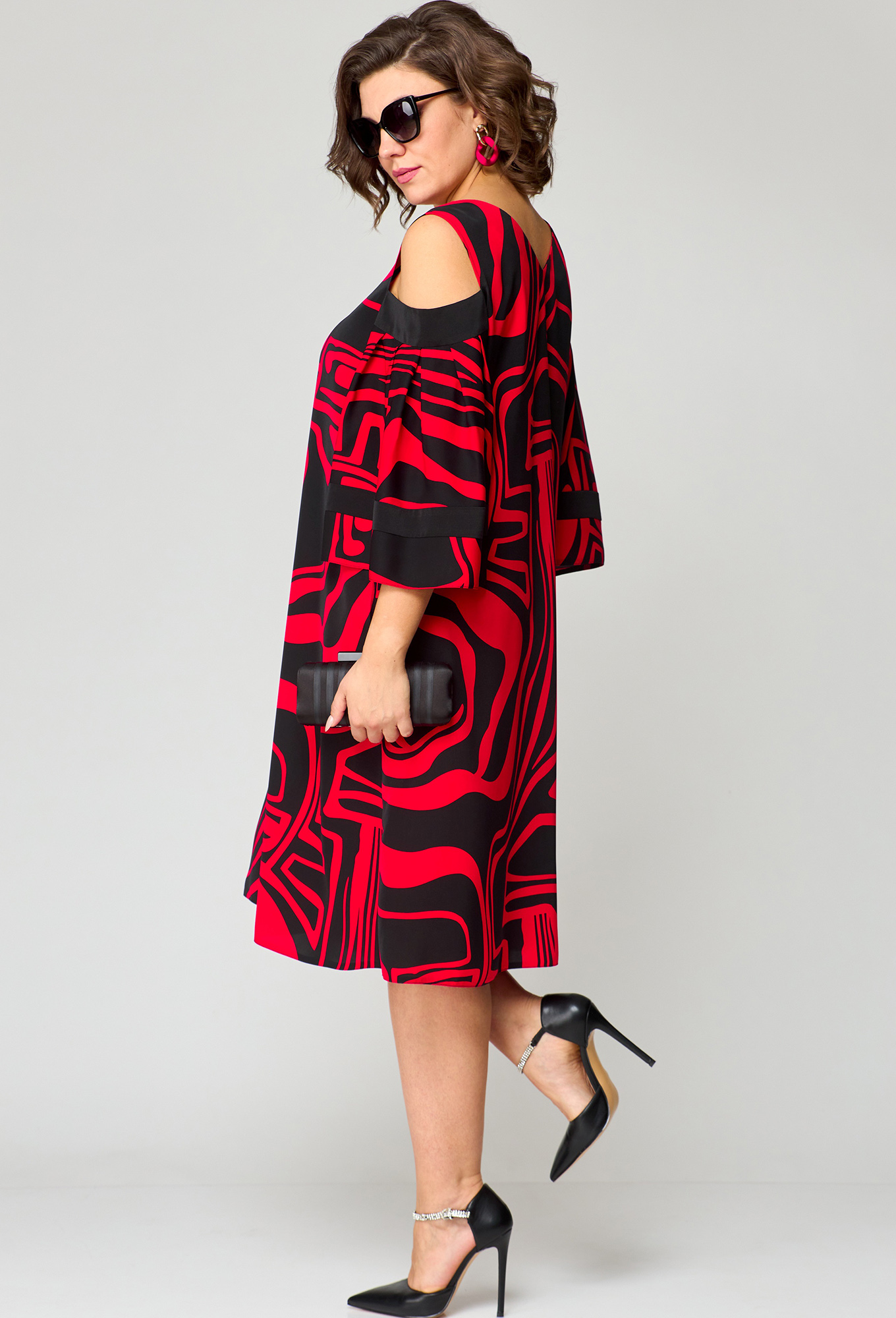 Платье женское нарядно-повседневное А-силуэта выполнено из плательной ткани двух дизайнов. Вырез горловины круглый на обтачке с открытым плечом со сборкой по верху. В боковых швах обработаны карманы. По спинке вырез горловины V-образный. Декором платья служат вставки по рукавам из отделочной ткани.