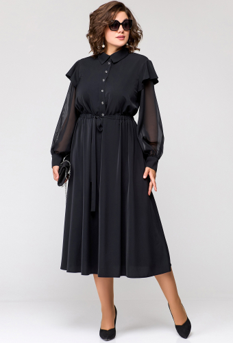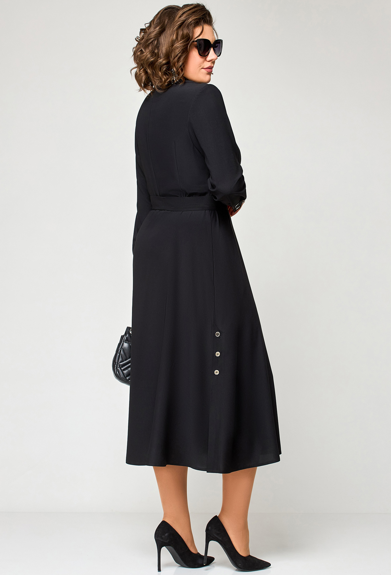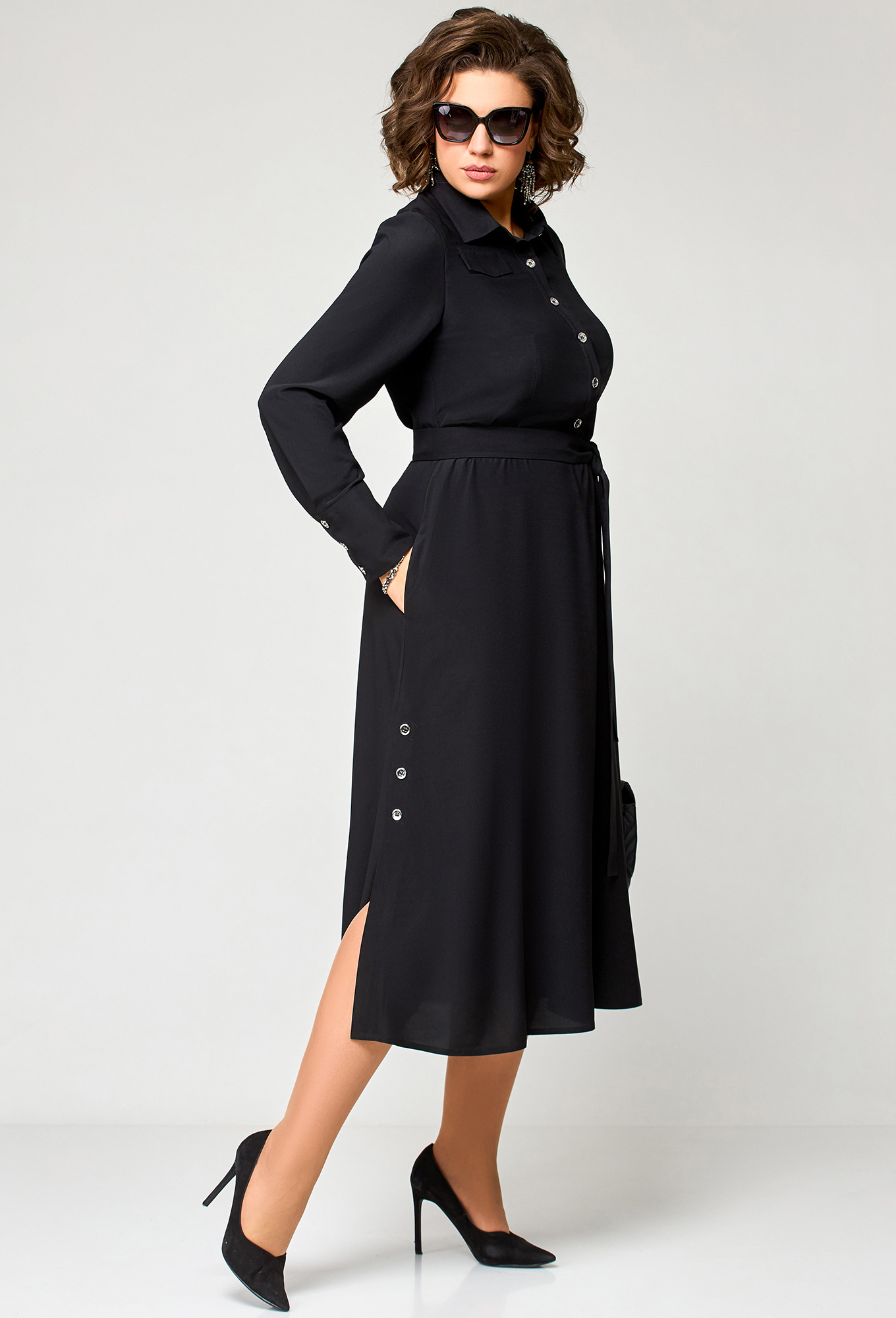 Платье женское нарядное. Отрезное по линии талии, выполнено из плательной ткани. До талии платье полуприлегающего силуэта, юбка расширенная к низу, в боковых швах юбки обработаны карманы и шлицы зафиксированные на обмётанные петли и пуговицы. По лифу платья центральная планка на пуговицах и воротник рубашечного типа, рукав длинный втачной на высокой манжете. С правой стороны лифа настрочен клапан ( имитация кармана ). Съёмный пояс подчеркнет талию.