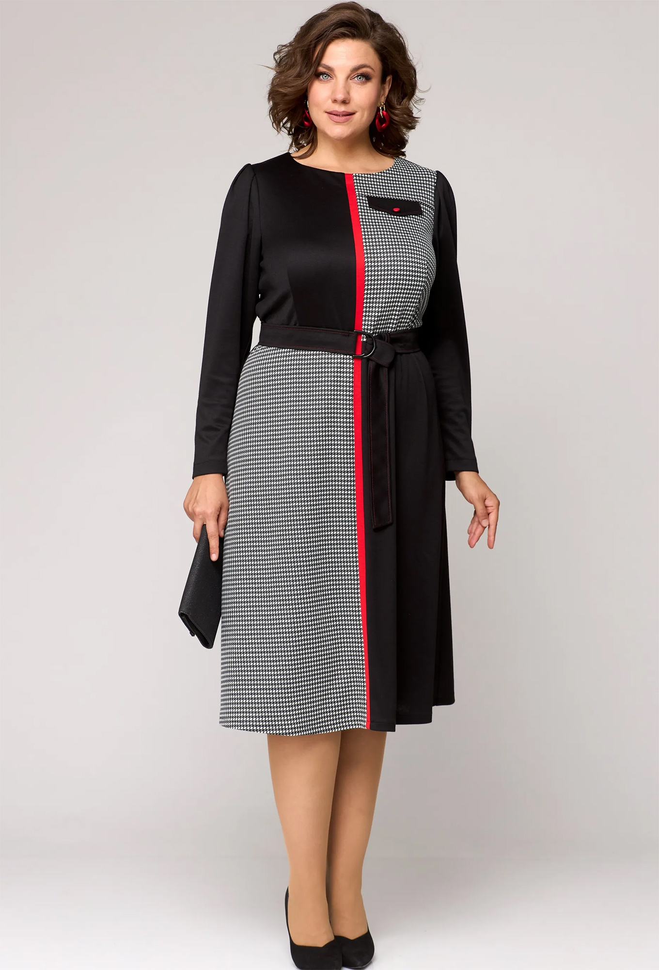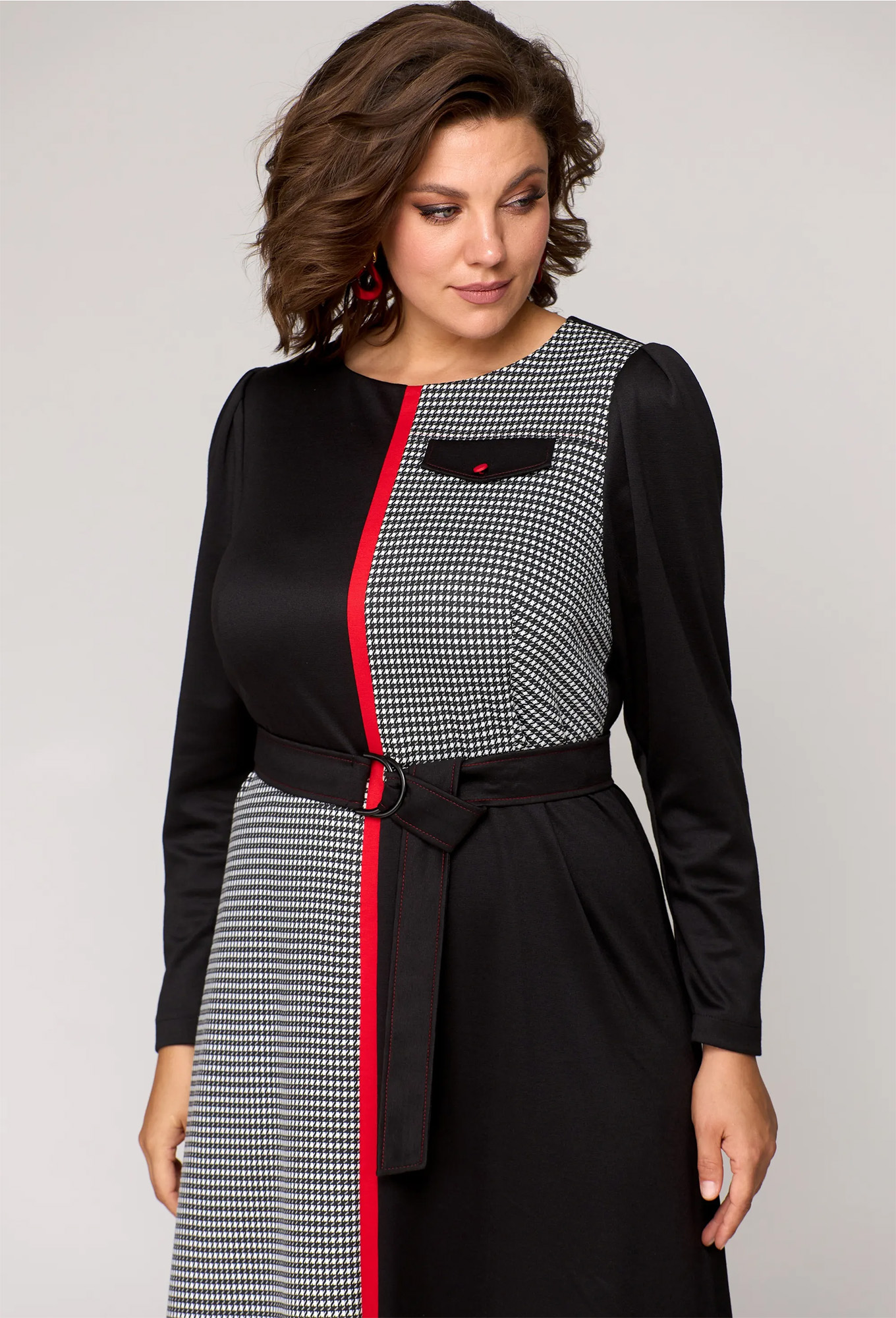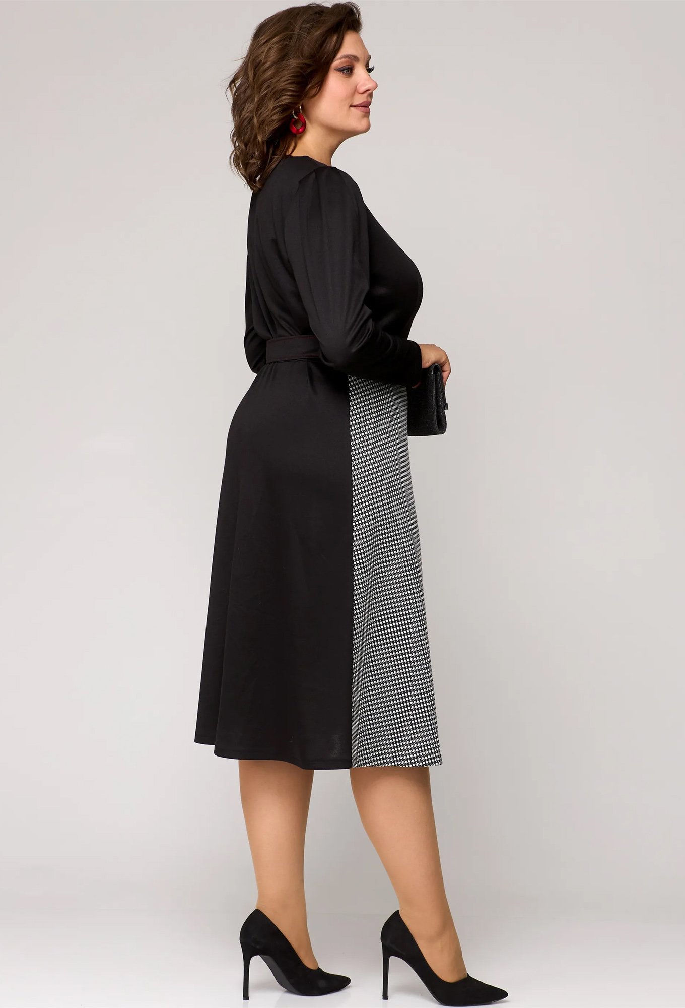 Платье женское нарядно-повседневное прилегающего силуэта до талии и расширенное книзу, выполнено из трикотажного полотна двух дизайнов. Вырез горловины круглый на обтачке, рукав втачной со складками по окату. По спинке потайная застежка молния. По центру полочки вставка из отделочной ткани и клапан с пришивной пуговице. Декором служит съемный пояс с пряжкой
