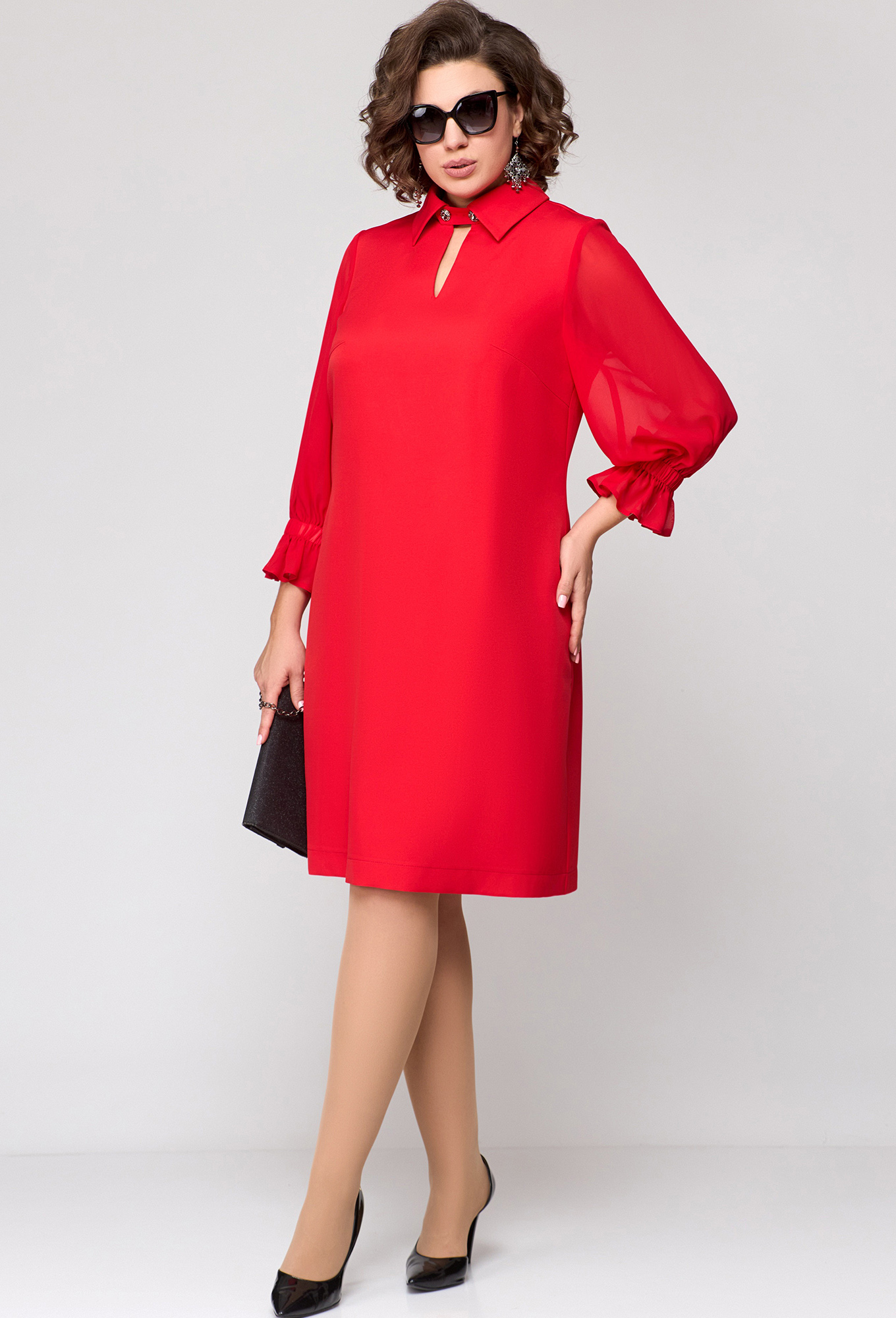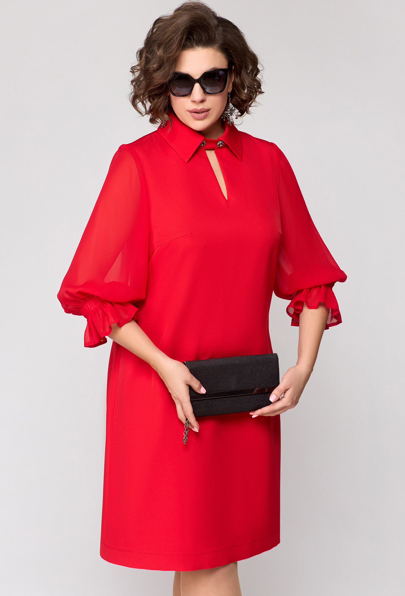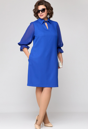 Платье женское нарядно-повседневное А-силуэта выполнено из плательной ткани в сочетании с шифоном. Вырез горловины - воротник на стойке рубашечного типа. По центру переда отделочный элемент в виде "капельки" зафиксированный патой с отделочными пуговицами. Пата съемная. Рукав втачной 7/8 из шифона по низу с воланом. В боковых швах обработаны карманы. Декором платья служат отделочные пуговицы со стразами.