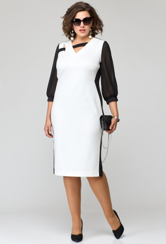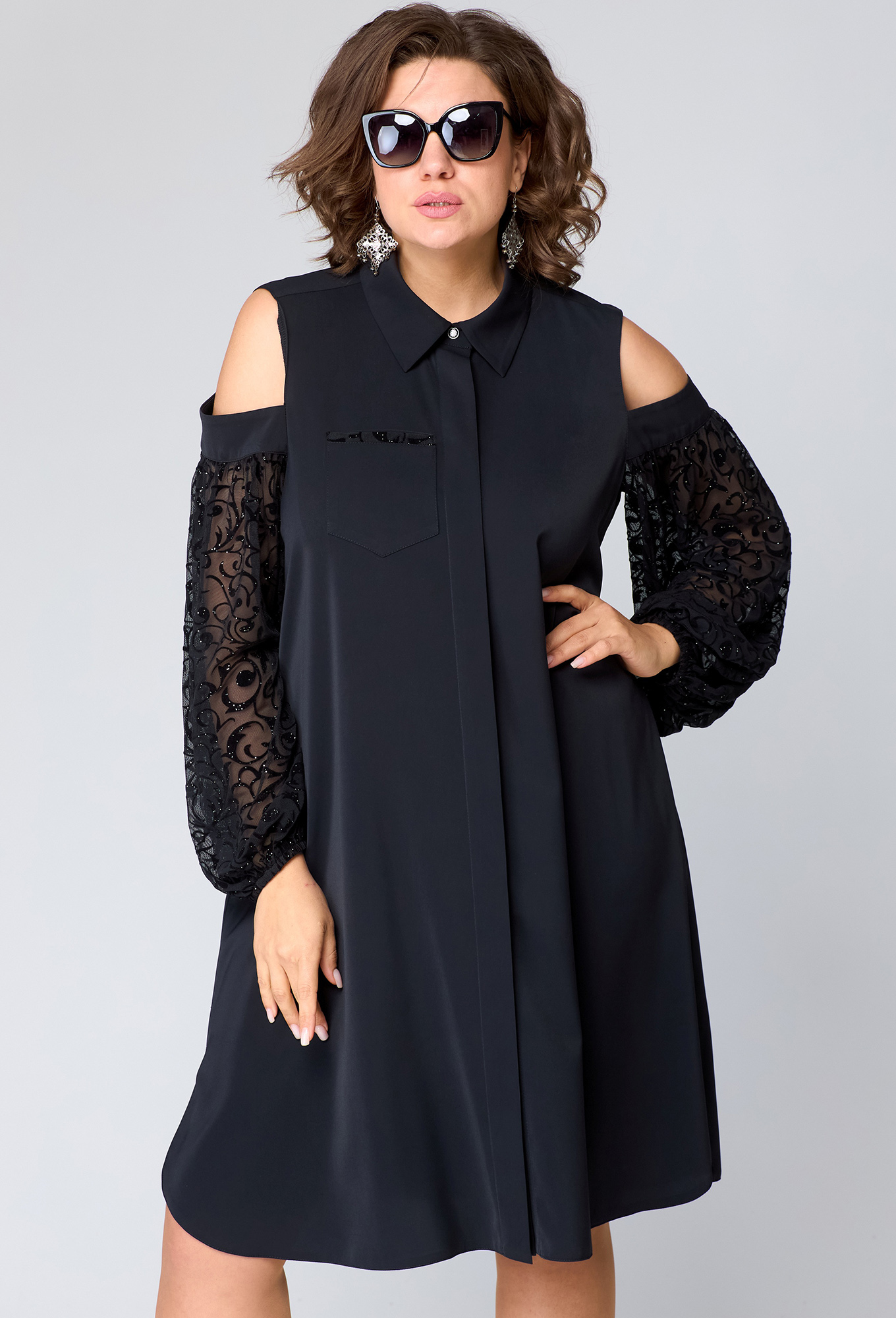 Платье женское нарядное А-образного силуэта выполнена из плательной ткани в сочетании с декоративной сеткой с набивным кружевом. Вырез горловины воротник на стойке рубашечного типа. Застежка потайная доверху на обметанные петли и пуговицы. Рукав втачной из декоративной сетки с набивным рисунком с открытым плечом со сборкой по верху и по низу. Низ рукава собран на резинку. В боковых швах обработаны разрезы. По правой полочке накладной карман. Декором служит принт на ткани рукавов и отделка по карману.