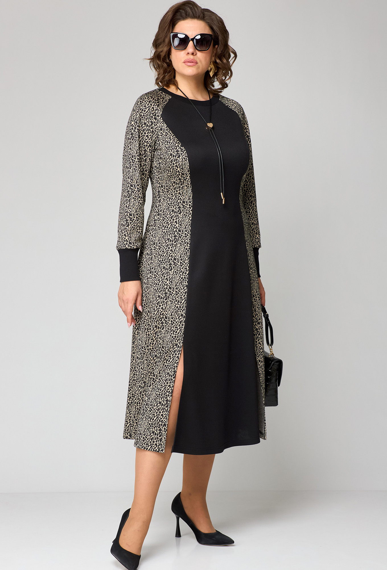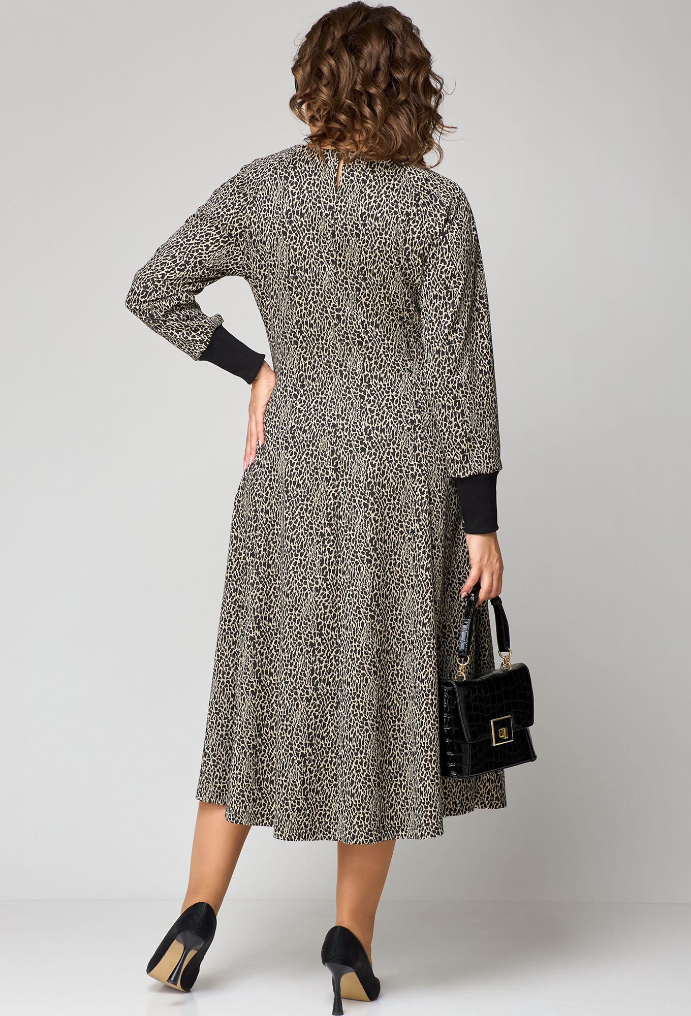 Платье женское повседневное полуприлегающего силуэта расширенное к низу выполнено из трикотажного полотна двух дизайнов. Вырез горловины мягкая обтачка из отделочной ткани, по спинке застежка на одну пуговицу и навесную петлю. Рукав реглан по низу на широкой притачной манжете из отделочной ткани. В боковых швах обработаны карманы, по центральной части полочки небольшие разрезы Декором платья служит анималистический принт.