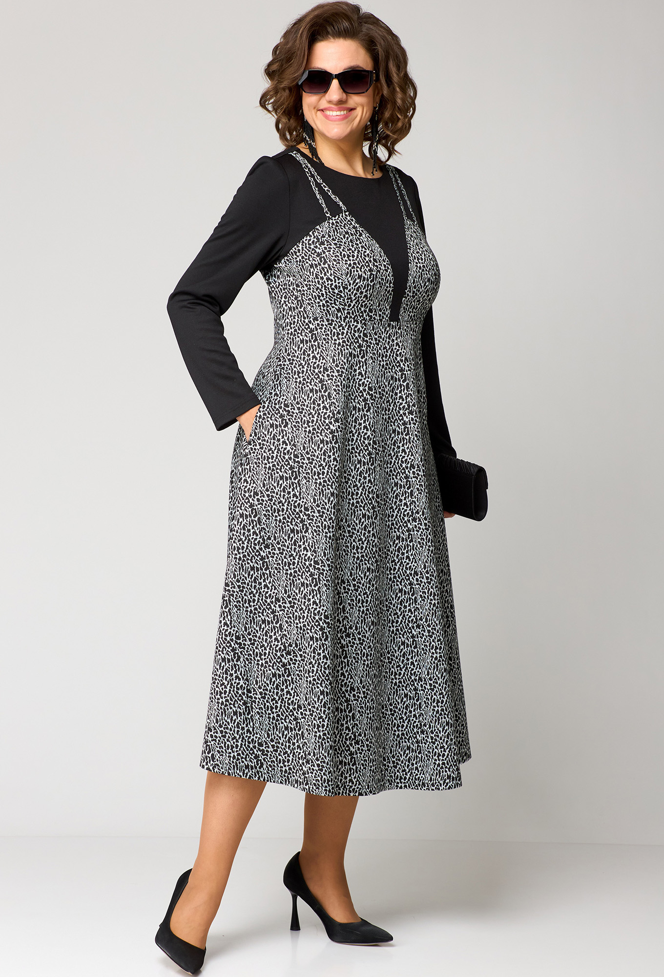 Платье женское повседневное полуприлегающего силуэта расширенное к низу выполнено из трикотажного полотна в сочетании двух дизайнов. Вырез горловины круглый на обтачке. Рукав втачной, по переду декоративный подрез и отделочные элементы в виде шлеек входящие в плечо. В боковых швах обработаны карманы. Декором платья служит дизайн трикотажа с анималистичным принтом.