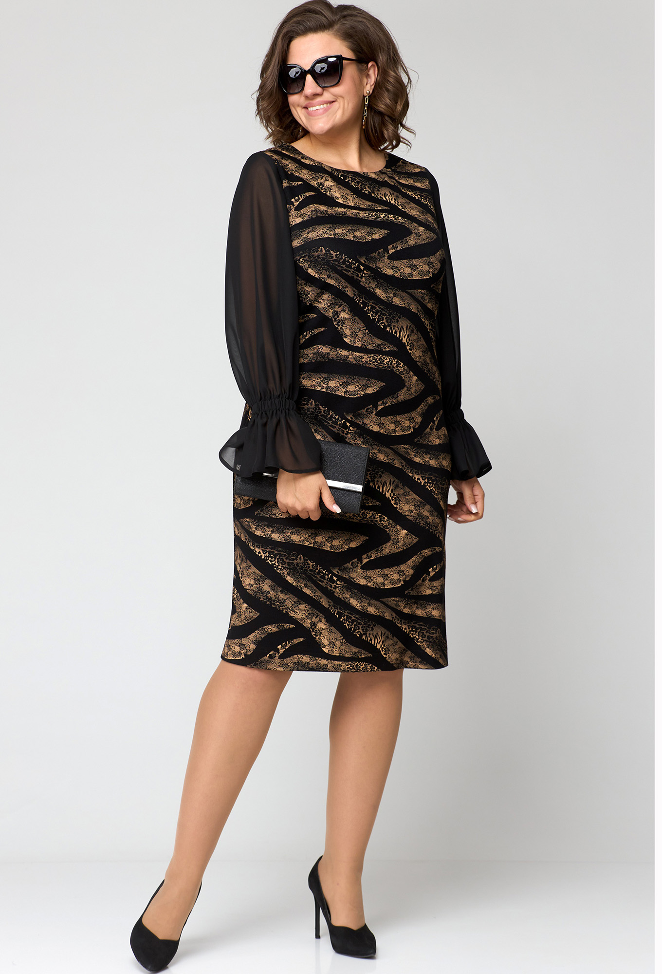 Платье женское нарядно полуприлегающего силуэта слегка расширенное к низу выполнено из трикотажного полотна в сочетании с шифоном. Вырез горловины круглый обработан обтачкой, рукав втачной по низу с воланам. Спинка с центральным швом и потайной застежкой -молнией. По низу спинки обработан небольшой разрез. Декором платья служит дизайн основной ткани.