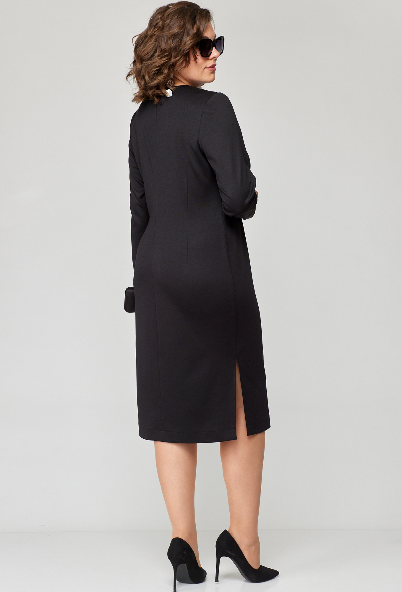 Платье женское нарядно-повседневное прилегающего силуэта выполнено из трикотажного полотна двух расцветок. Вырез горловины круглый на обтачке, рукав втачной. Центральная часть полочки фигурная из отделочной ткани. По линии талии вставка из ткани в виде пояса. В боковых швах обработаны разрезы. Спинка с центральным швом и потайной тесьмой молнией. Декором служит нашивка по центральной части полочки.