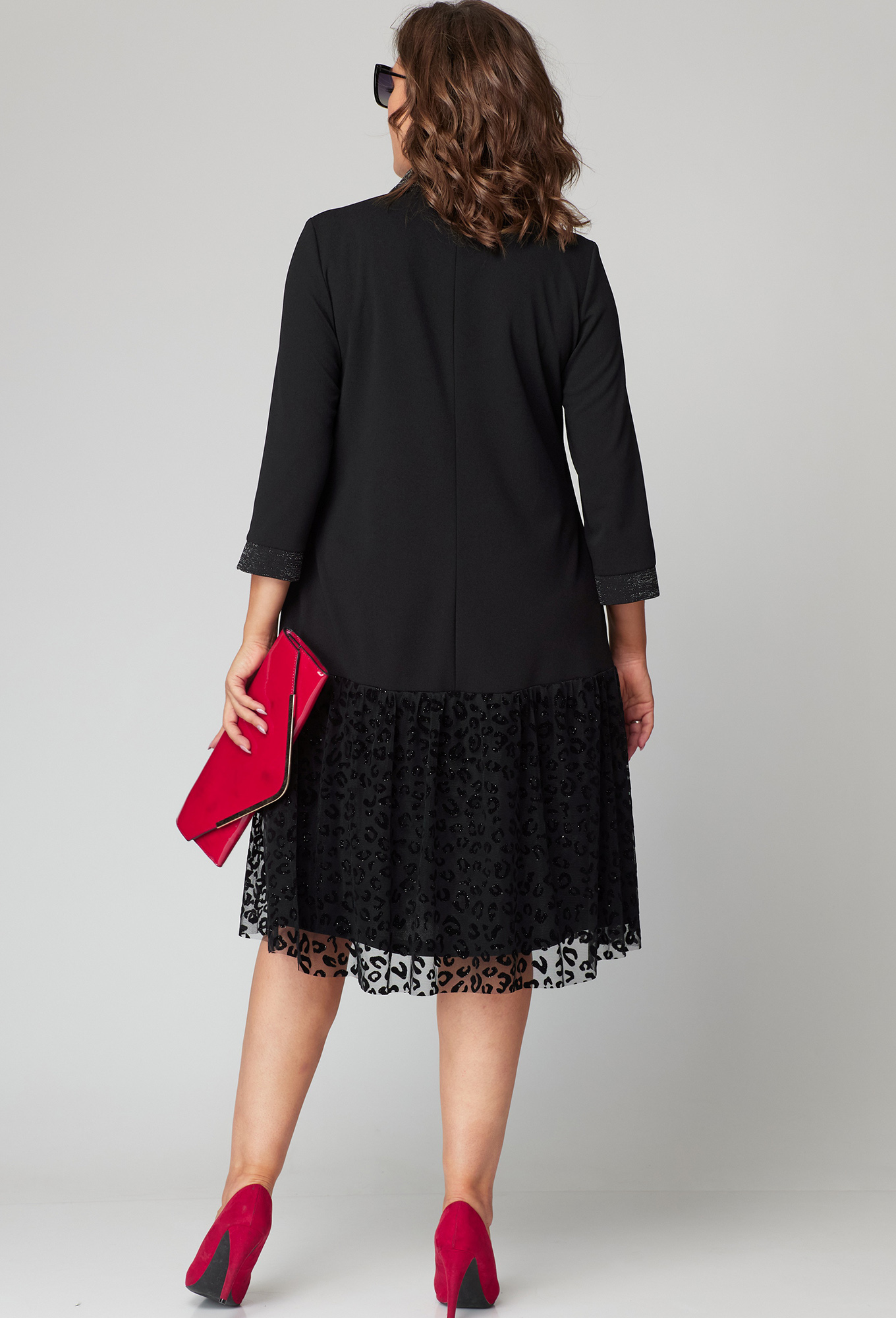 Платье женское нарядно-повседневное выполнено из крепа в сочетании с кружевом и отделкой из крепа с люрексом. Вырез горловины воротник на стойке рубашечного типа, рукав втачной 7/8 по низу на притачной манжете из отделочной ткани по полочке нагрудные вытачки. По низу двойной волан собран на сборку. Застежка потайная с планкой из отделочной ткани до волана. Декором служит дизайн отделочной ткани и кружева.