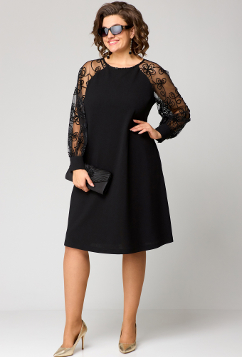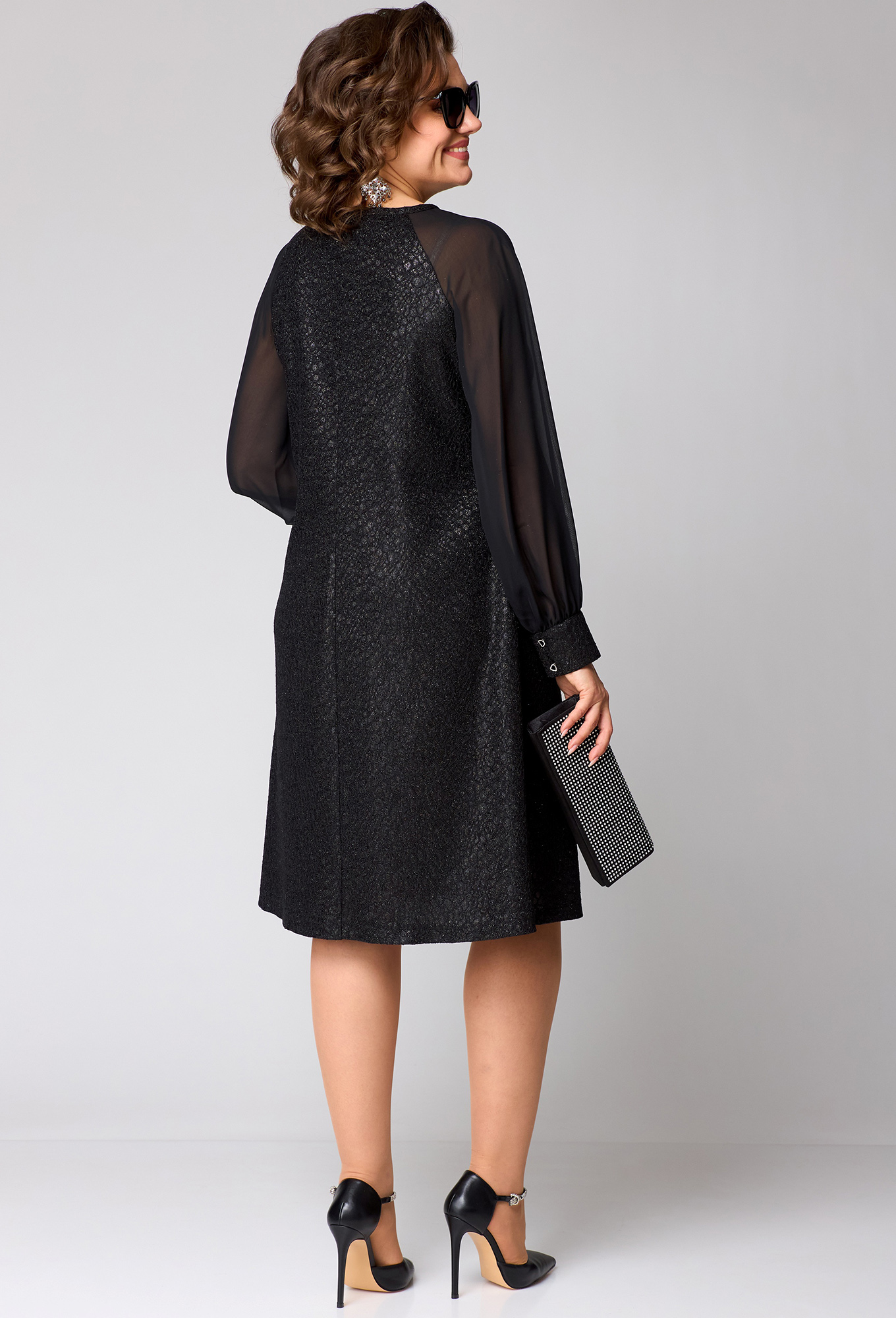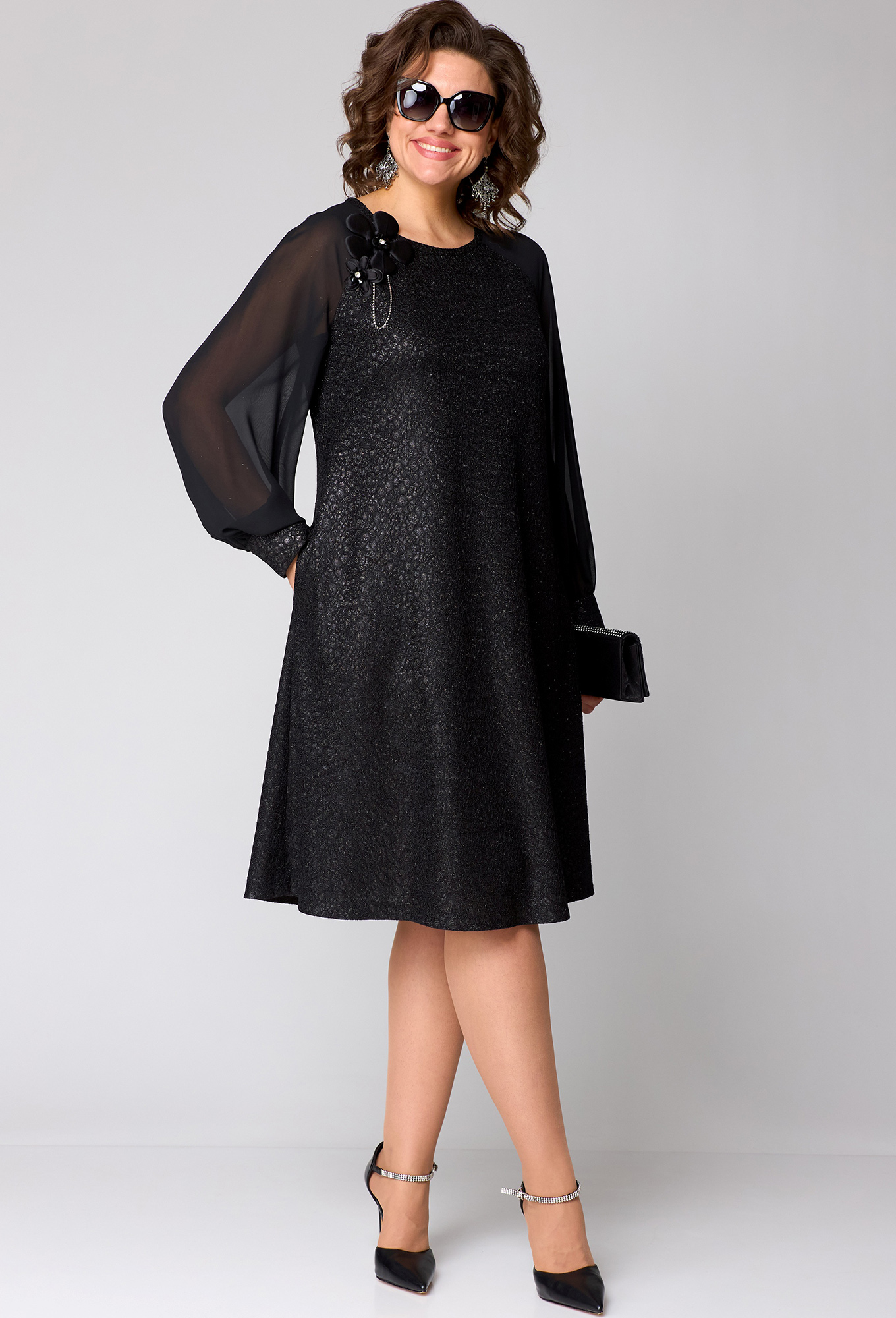 Платье женское нарядное А-силуэта выполнено из текстильной ткани в сочетании с шифоном. Вырез горловины круглый обработан бейкой из отделочной ткани, рукав реглан по низу на притачной манжете. В боковых швах обработаны карманы. По спинке декоративная вставка из отделочной ткани. Декором служит съемная брошь в виде 2х цветков.