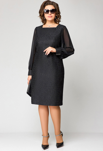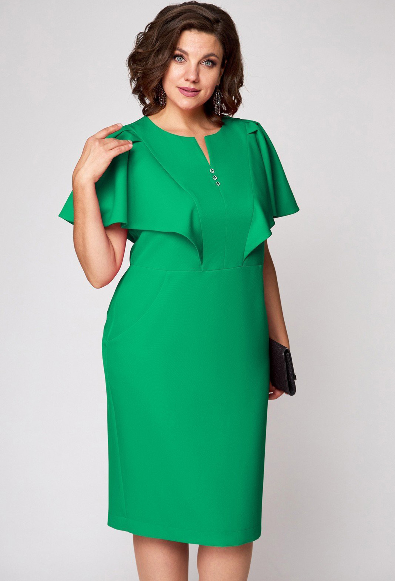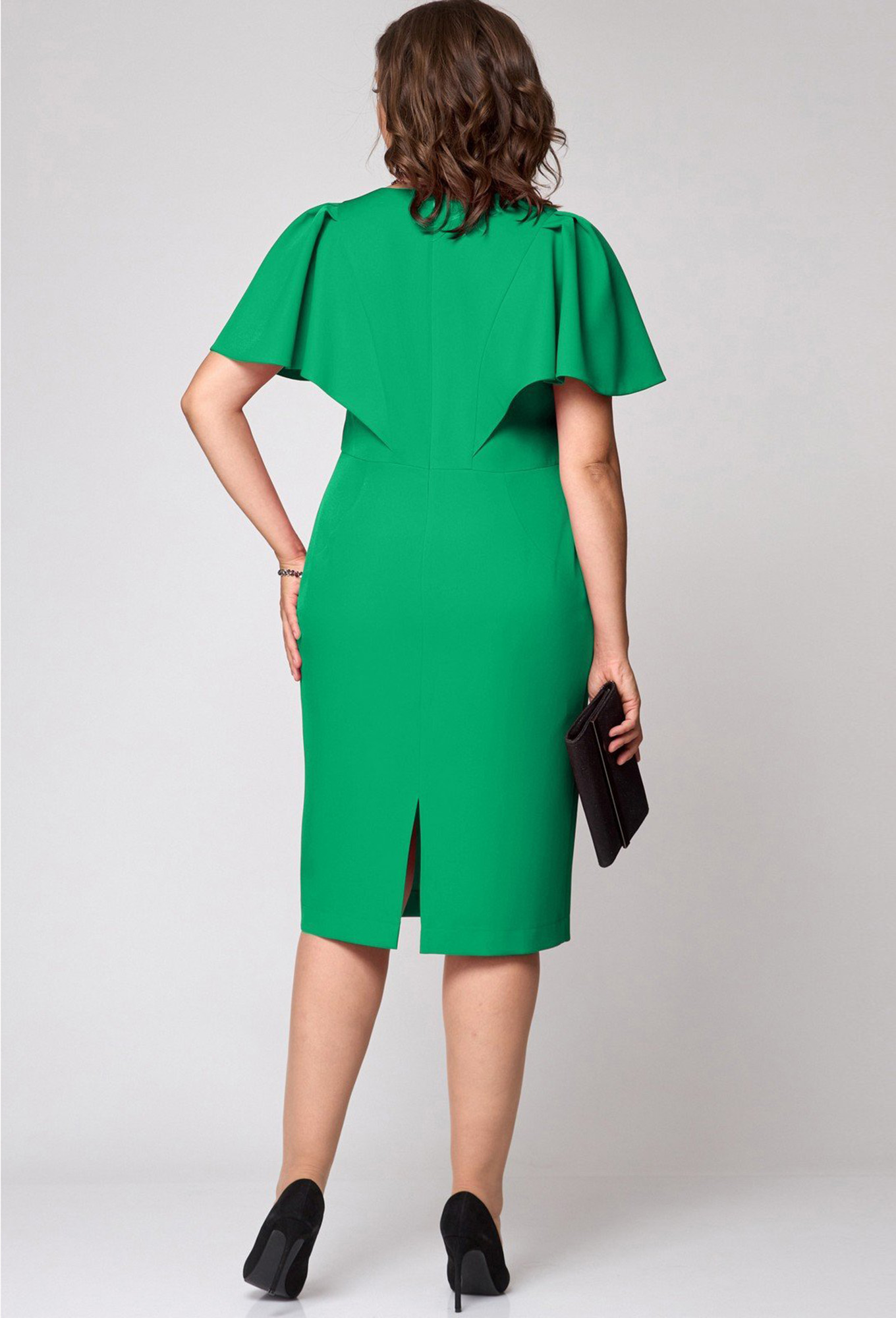 Платье женское нарядное прилегающего силуэта выполнено из костюмно-плательной ткани. Вырез горловины фигурный, обработан обтачкой. Рукав двойное крыло-волан входящий в рельефы платья. Пройма обработана обтачкой. По спинке потайная тесьма молния и разрез. Декором служат три отделочные пуговицы.
