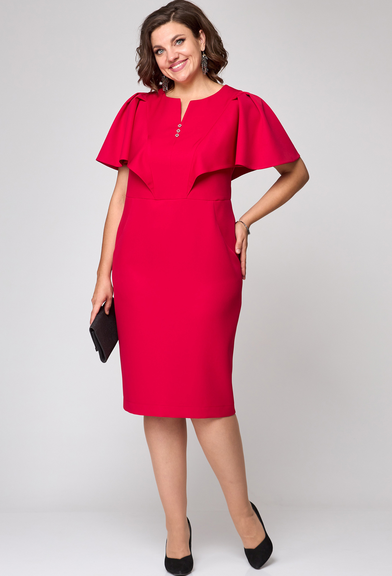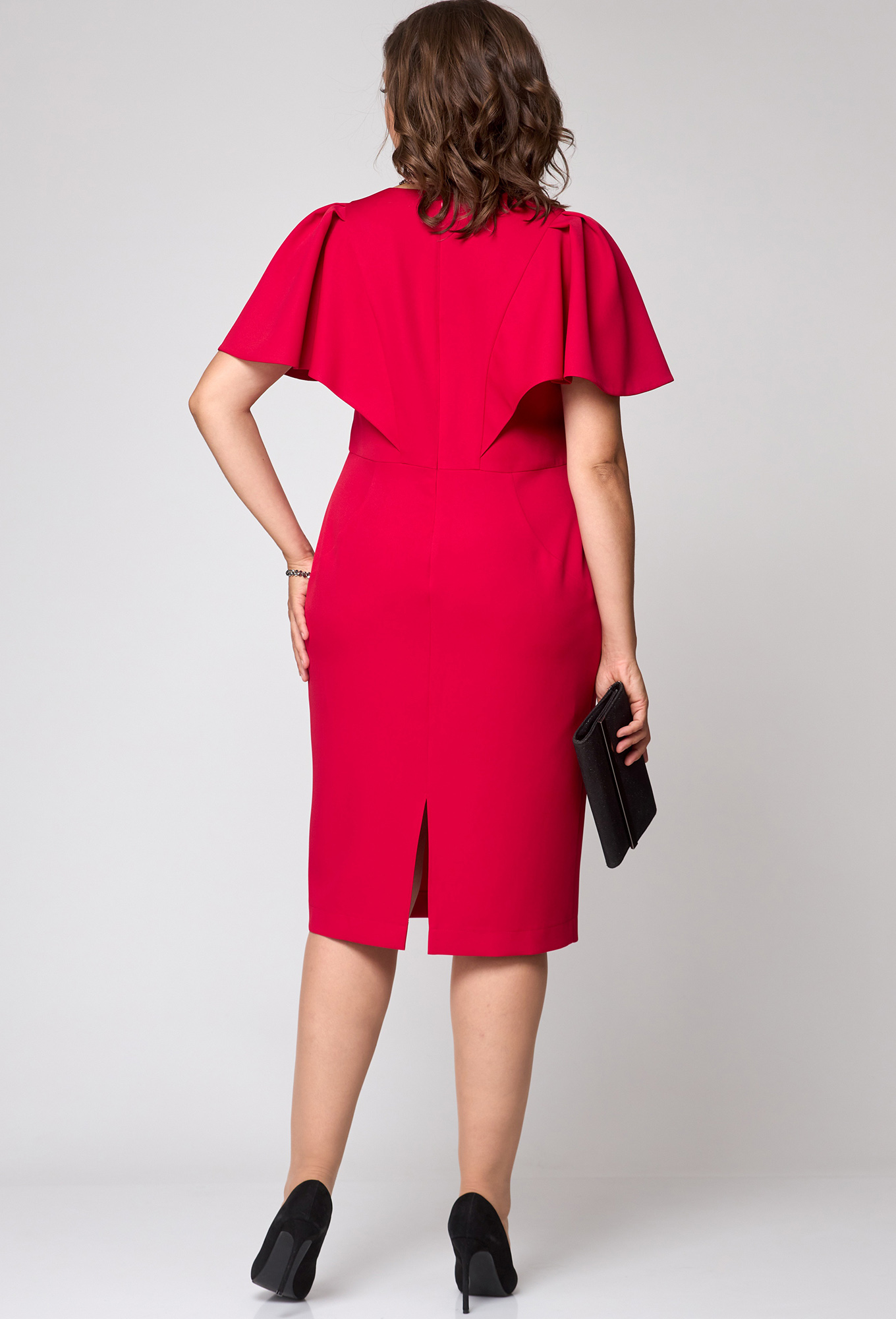 Платье женское нарядное прилегающего силуэта выполнено из костюмно-плательной ткани. Вырез горловины фигурный, обработан обтачкой. Рукав двойное крыло-волан входящий в рельефы платья. Пройма обработана обтачкой. По спинке потайная тесьма молния и разрез. Декором служат три отделочные пуговицы.
