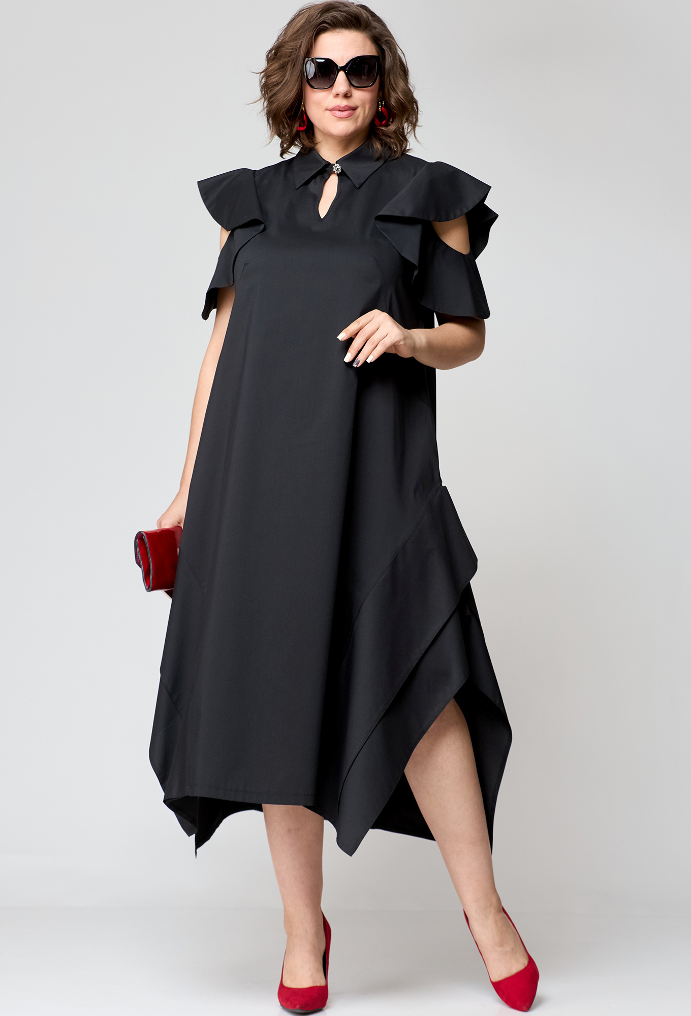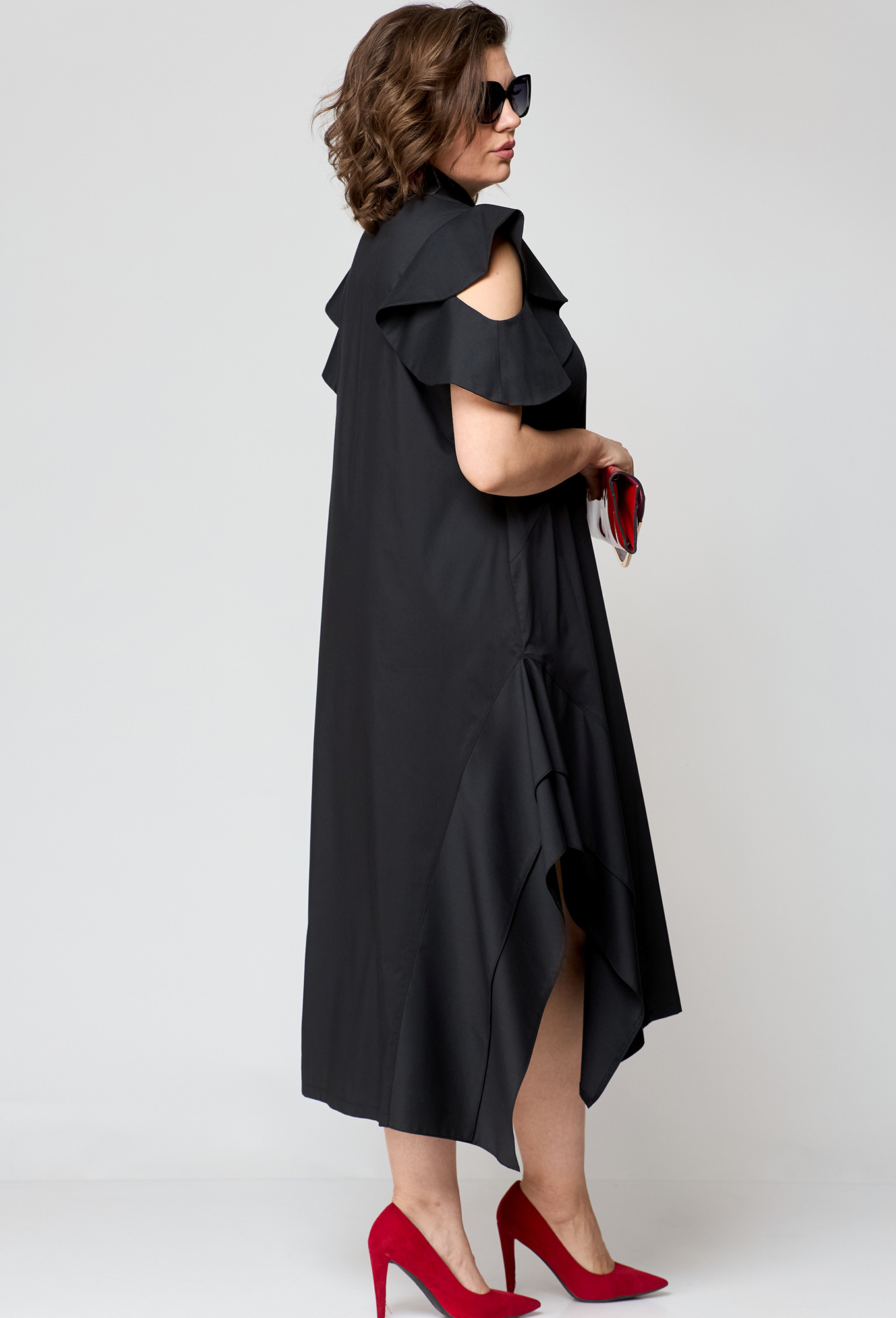 Платье женское нарядно-повседневное полуприлегающего силуэта расширенное к низу с ассиметричными воланами по боковым швам. Вырез горловины воротник на стойке рубашечного типа по центру с отделочным элементом и навесной петлей и пуговицей. Рукав втачной "Фэнтези" в виде крылышка частично с открытым плеом. В боковых швах обработаны карманы разрезы. Декором платья служит пуговица отделочная со стразами и фигурные воланы по низу и боковым платья.