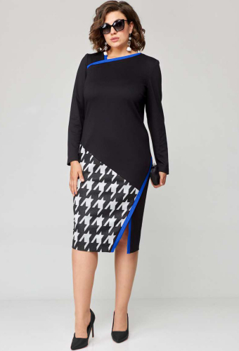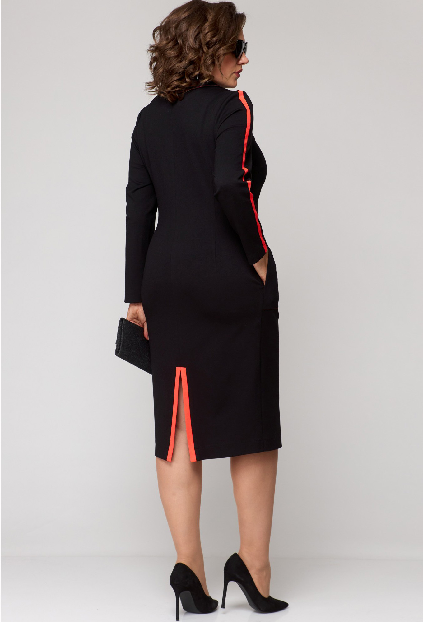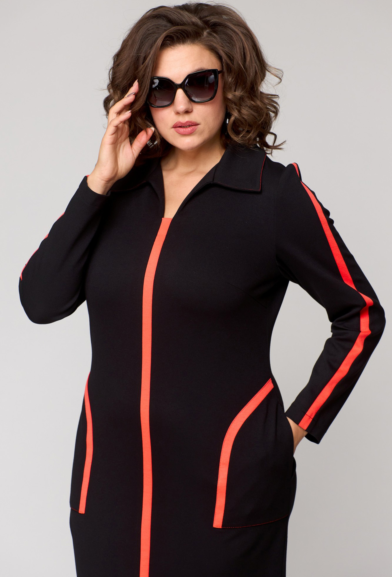 Платье женское нарядно-повседневное прилегающего силуэта, выполнено из трикотажного полотна в сочетании с отделкой. Вырез горловины отложной воротник. По центру переда втачная планка из отделочной ткани, нагрудные выточки и накладные карманы. Рукав втачной, по центру с отделкой.спинка с центральным швом и небольшим разрезом обработанным отделочной тканью. Декором служат детали из отделочной ткани и нашивка на воротнике.