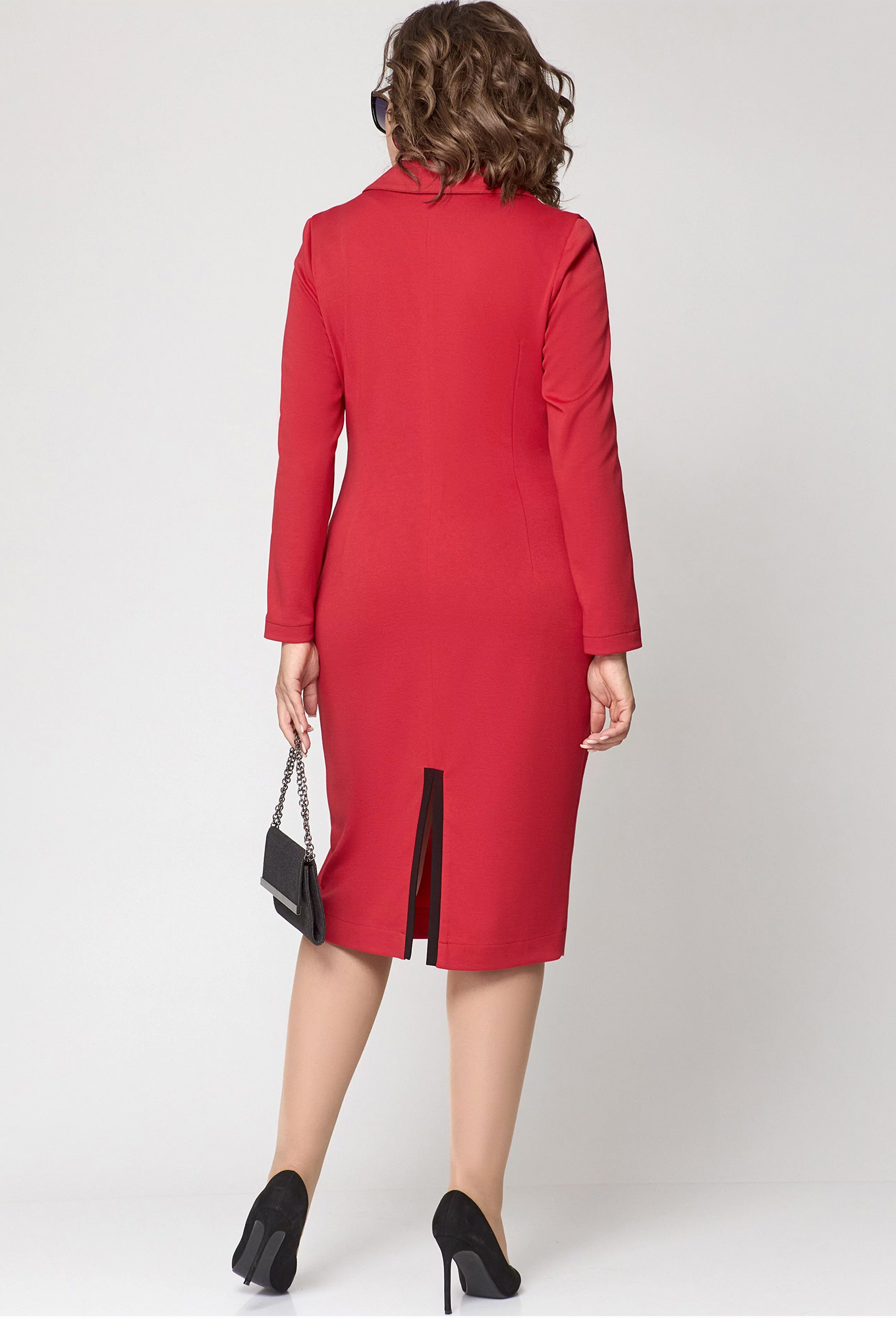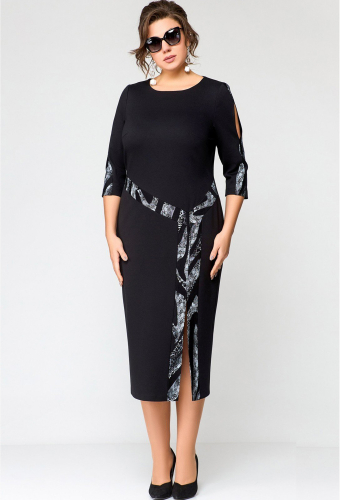 Платье женское нарядно-повседневное прилегающего силуэта, выполнено из трикотажного полотна в сочетании с отделкой. Вырез горловины отложной воротник. По центру переда втачная планка из отделочной ткани, нагрудные выточки и накладные карманы. Рукав втачной, по центру с отделкой.спинка с центральным швом и небольшим разрезом обработанным отделочной тканью. Декором служат детали из отделочной ткани и нашивка на воротнике.