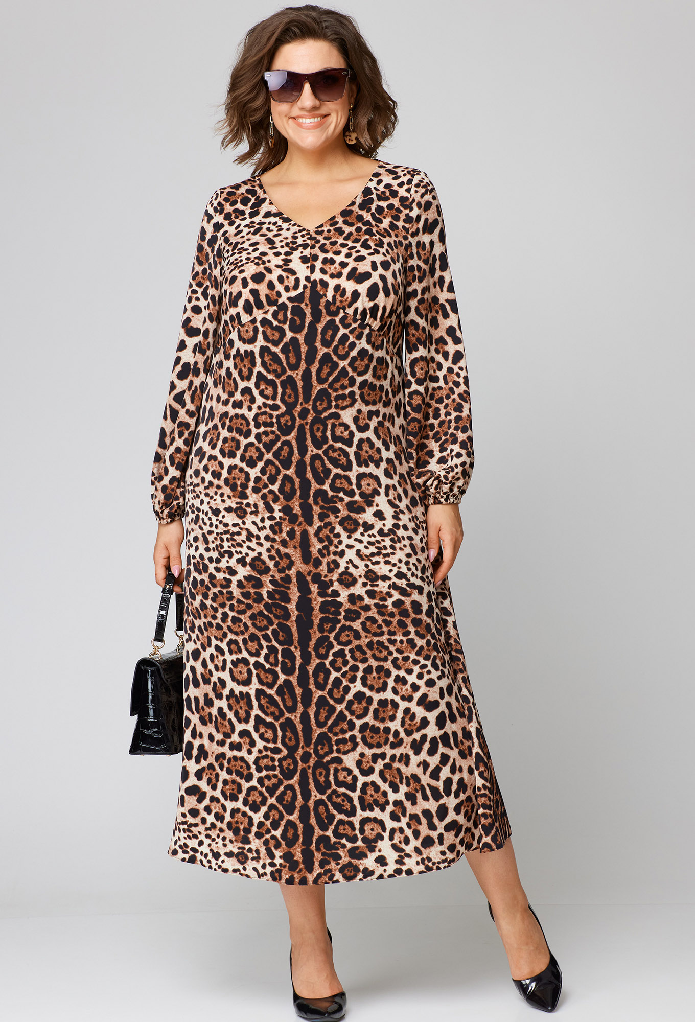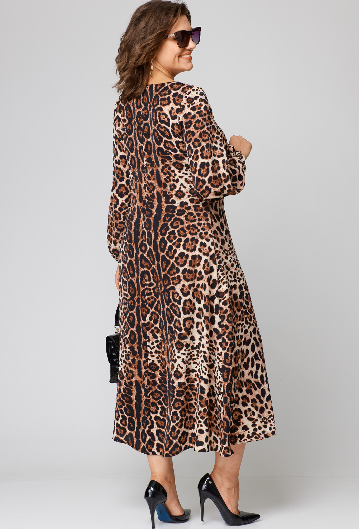 Платье женское полуприлегающего силуэта расширенное к низу, выполнено из плательной ткани с анималистичным принтом . Вырез горловины V образный обработан обтачкой , рукав втачной по низу собран на резинку. Под грудью фигурный подрез со сборкой. Декором платья служит дизайн самой ткани.
