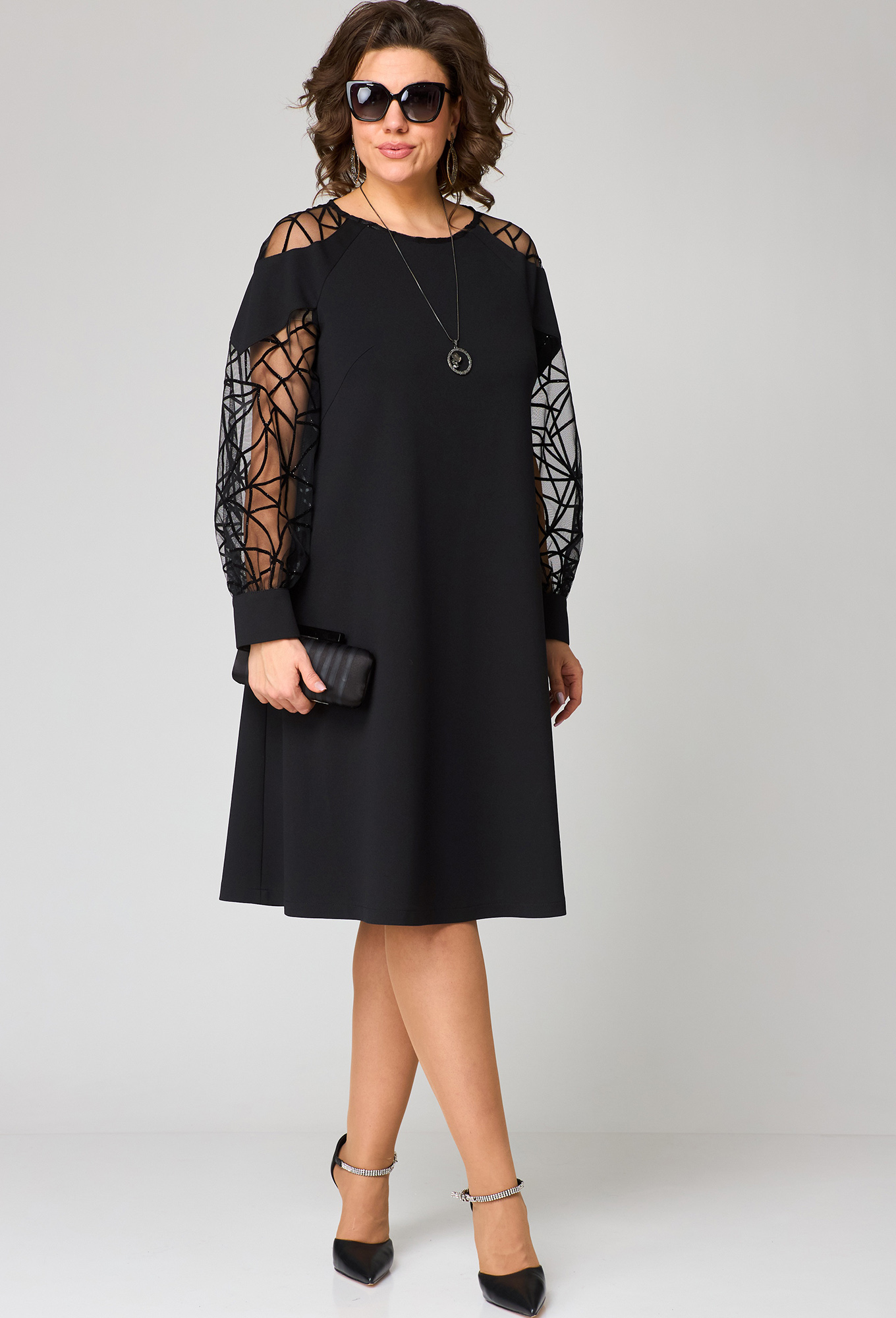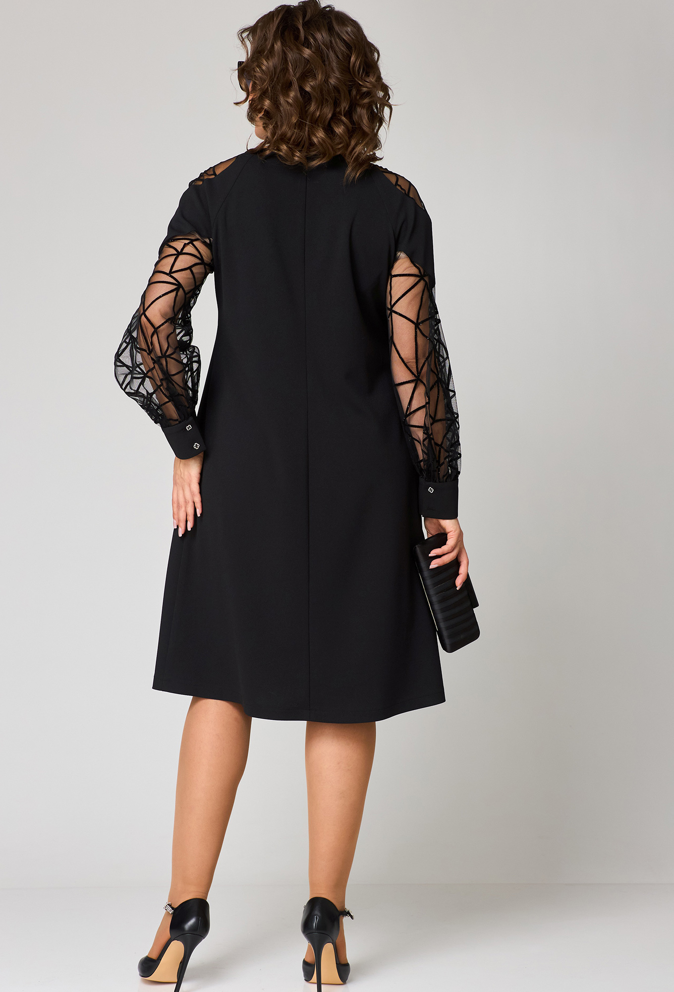 Платье женское нарядно-повседневное А-силуэта выполнено из крепа в сочетании с сеткой с наливным рисунком. Вырез горловины круглый обработан бейкой, рукав реглан со вставками из сетки по низу на притачной манжете. Декором платья служа сетка с набивным рисунком и отделочные пуговиц по манжете рукава.
