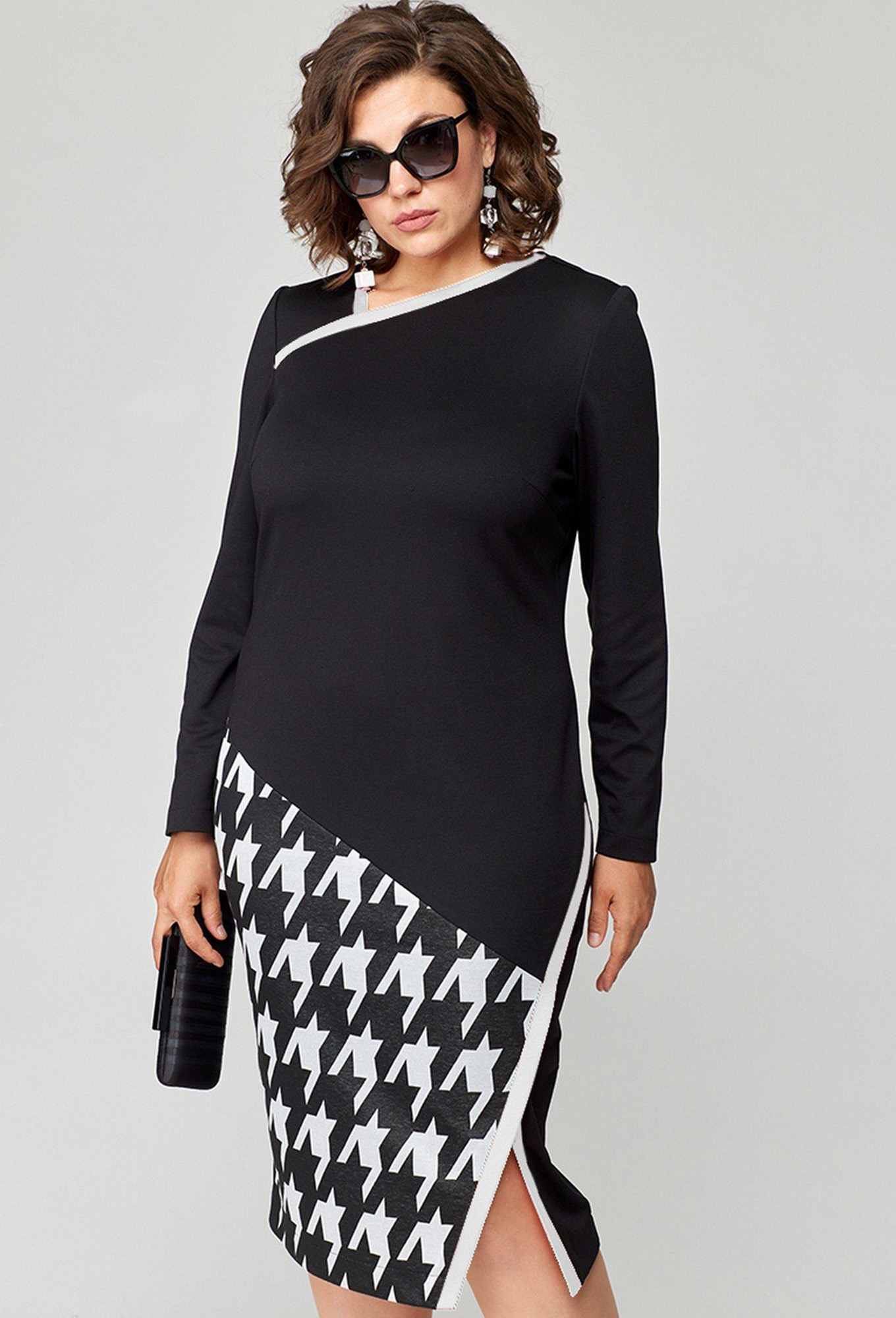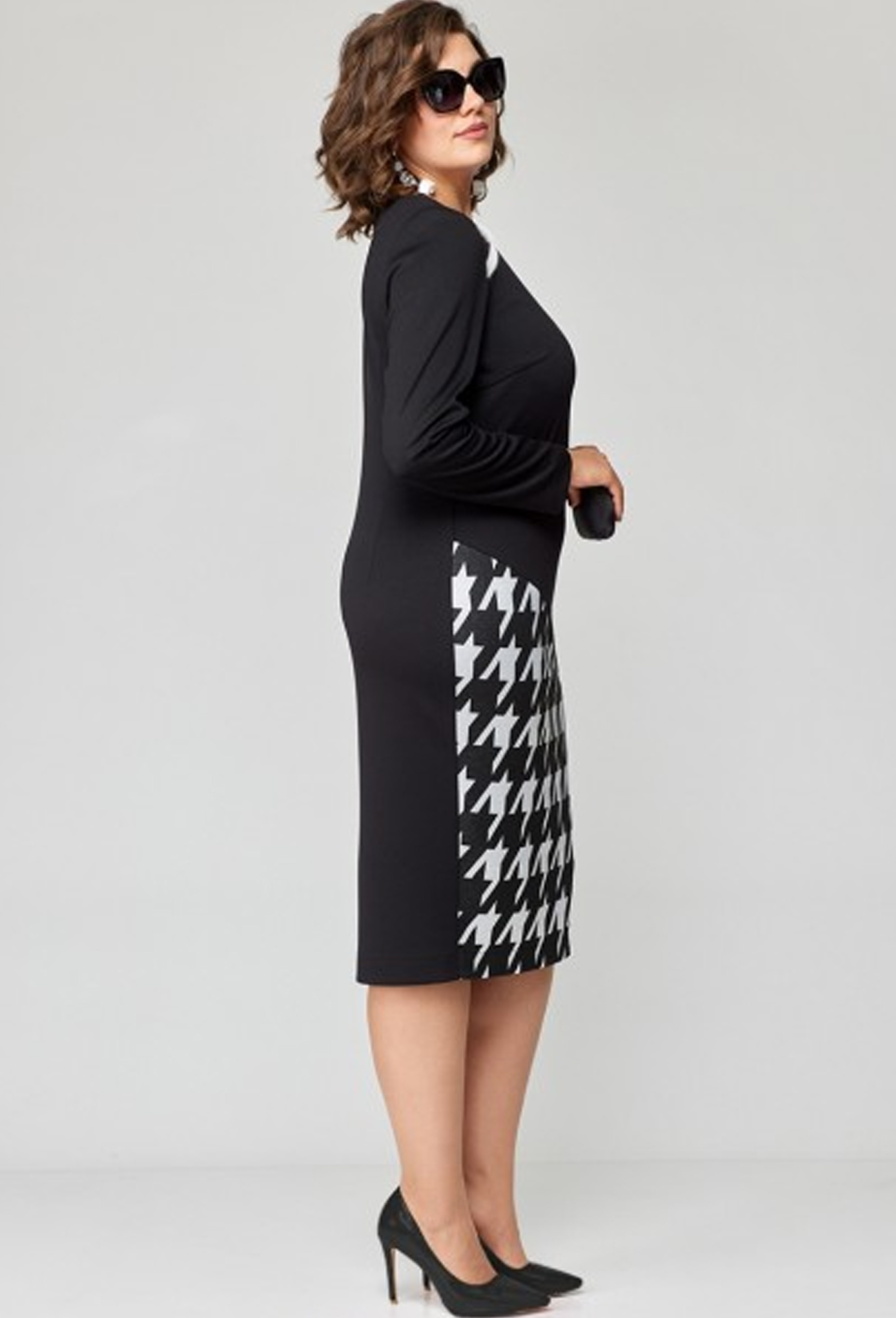 Платье женское нарядно-повседневное прилегающего силуэта, выполнено из трикотажного полотна разных дизайнов. Вырез горловины фигурный, обработан обтачками из отделочной ткани, рукав втачной, по полочке обработан разрез обработанный обтачками из отделочной ткани. Спинка с центральным швом и потайной застежкой молнией. Декором служит подрез по полочке и обтачки из отделочной ткани.