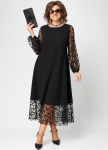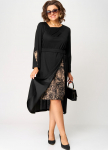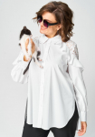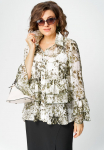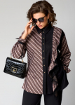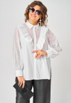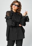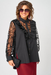 Блуза женская повседневная прямого силуэта, выполнена из трикотажного полотна двух дизайнов в сочетании с отделкой из кружева. Застежка доверху на петли и пуговицы, оротник на стойке рубашечного типа, плечо спущенное, рукав втачной по низу на притачной манжете. В боковх швах обработаны разрезы, с левой стороны по полочке притачная рюша из основной и отделочной ткани. Низ блузы фигурный. Декором блузы служат отделочные пуговицы и рюши.