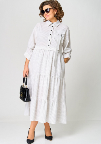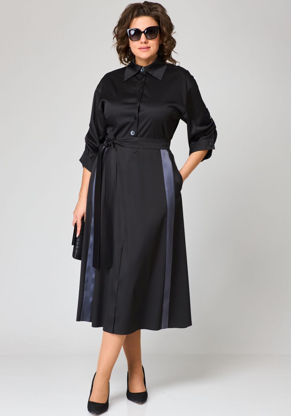 Платье женское нарядно-повседневное полуприлегающего силуэта до талии и расширенное к низу. Выполнено из плательной ткани в сочетании с отделкой. Платье отгрезное по талии. В боковых швах обработаны карманы, по переду юбки отделочные ввставки в виде вертикальных полос и центральный шов с разрезом, по спинке встречные склада. Вырез горловы воротник на стойке рубашечного типа. Застежка до талии на обментанные петли и пуговицы. Рукав втачной 7/8 по низу на притачной  манжете, в рукаве отделочная пата с помощью которой можно регулировать длину рукава. Декором платья служат вставки из отделочной ткани и пуговицы.