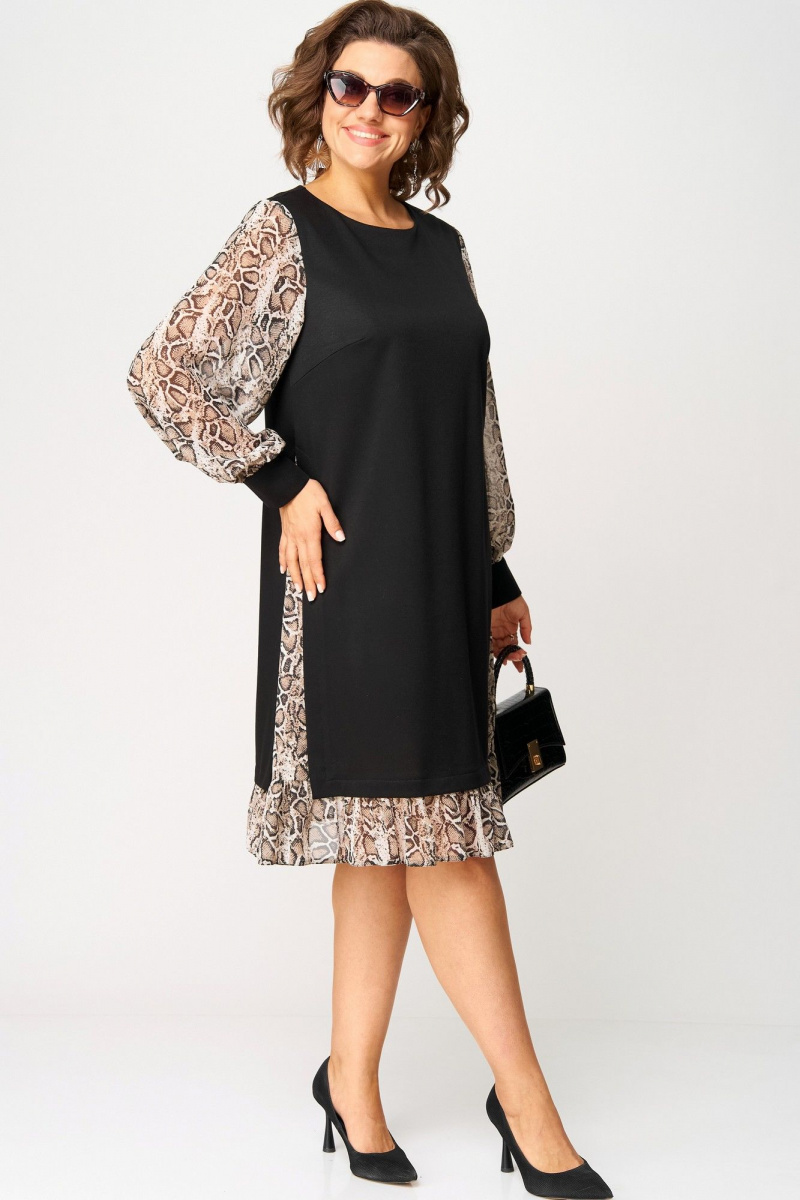 Платье женсоке нарядно-повседневное полуприлегающего силуэта расширенное к низу. Выполнено из трикотажного полотна в сочетании с шифоном. Вырез горловины круглый на обтачке, рукав втачной из шифона по низу на притачной манжете. По низу вставки из шифона с воланами. Декорм платья служат отделочные вставки из шифона и дизайн основной ткани.