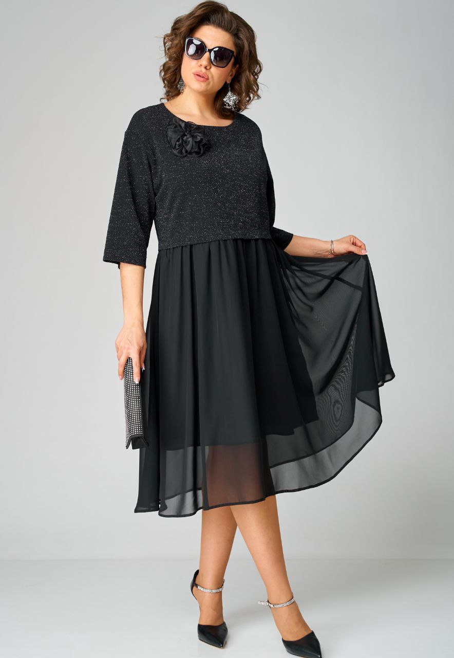 Платье женское нарядное полуприлегающего силуэта до талии, расширенное к низу отрезное по талии. Выполнено из трикотажного полотна в сочетании с шифоном. Вырез горловины круглый обработан обтачкой, по спинке застежка на навесную петлю и пуговицу. Рукав втачной 3/4. Юбка из шифона на подкладке, по талии собрана на сборку. Декором служит съемный цветок. ВНИМАНИЕ! Декор может отличаться от фото!
