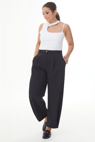 Юбка слегка зауженная к низу, на широком поясе, эластичном в области спинки, с наклонными боковыми карманами, застежкой и шлицей по центру передних половинок. Длина юбки в р.46-48 около 55 см, в р.50-52 около 58 см.