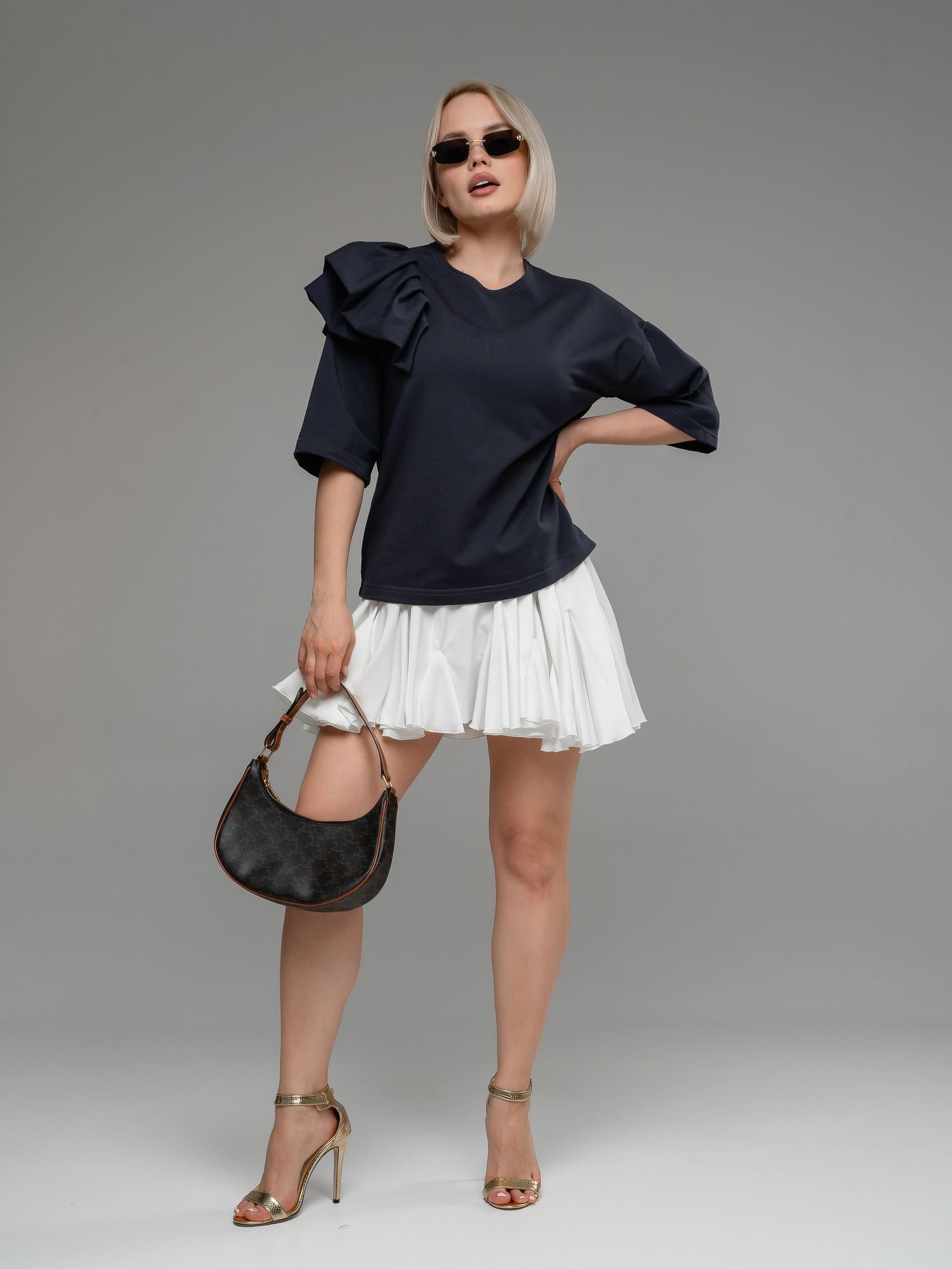Футболка женская из футера антрацитового цвета в стиле Оверсайз , рукавами длиной до локтя и объемным воланом на плече . Высокое содержание хлопка в составе 92 % позволит почувствовать максимальный комфорт и уверенность в себе, а добавление эластана 8 % придаcт этому изделию дополнительную прочность и износостойкость. Оверсайз стиль, рукава длиной до локтя и объемный волан - сделают элегантным ваш образ. Вы будете выглядеть превосходно в любой ситуации - будь это повседневный или наряд или для праздничных и вечерних выходов. Свободная, удлиненная футболка идеальный вариант для летнего периода. Благодаря своей универсальности данную модель можно носить как футболку с рюшами или женскую блузку. Изделие выполнено из трикотажа премиального качества - ПЕНЬЕ, с содержанием хлопка более 92%