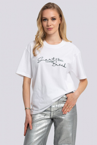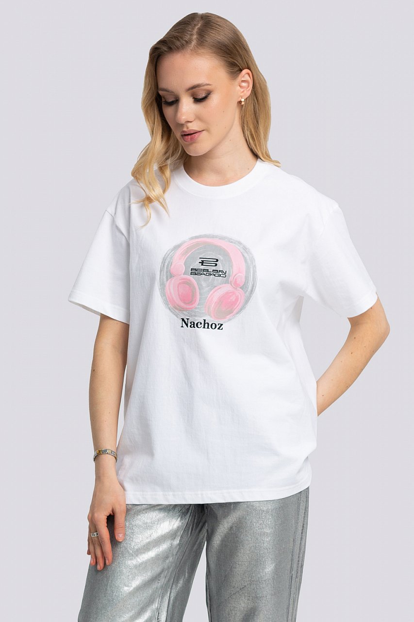 Эта модная футболка с коротким рукавом - идеальный выбор для тех, кто следит за последними тенденциями в мире моды. Базовая, белая, но в то же время стильная. Принт на передней части делает её настоящим хитом сезона. Благодаря свободному крою и оверсайз-стилю, эта футболка будет комфортна и удобна в любых ситуациях. Универсальный дизайн позволяет сочетать её с различными видами одежды, создавая уникальные образы. Этот трендовый предмет одежды станет неотъемлемой частью гардероба любой молодой женщины. белый