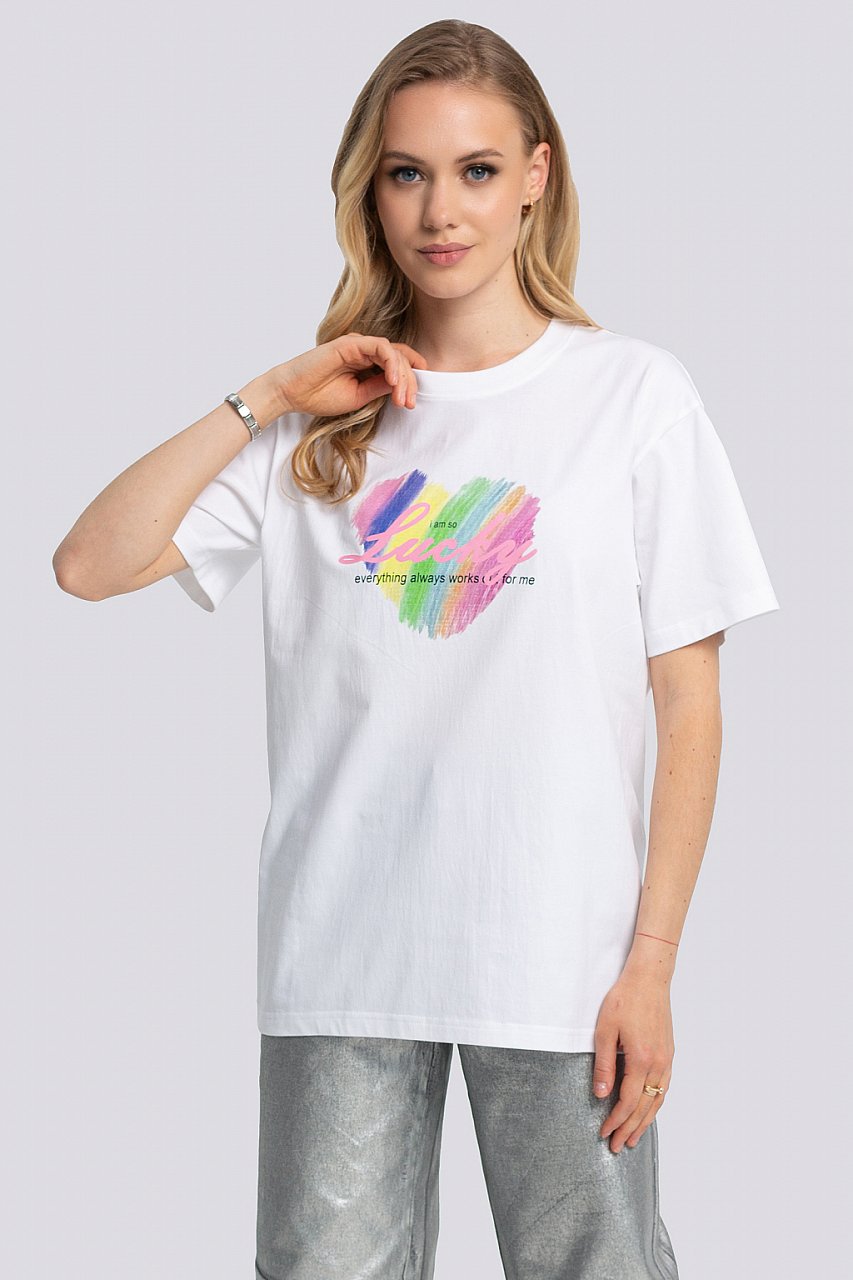 Эта модная футболка с коротким рукавом - идеальный выбор для тех, кто следит за последними тенденциями в мире моды. Базовая, белая, но в то же время стильная. Принт на передней части делает её настоящим хитом сезона. Благодаря свободному крою и оверсайз-стилю, эта футболка будет комфортна и удобна в любых ситуациях. Универсальный дизайн позволяет сочетать её с различными видами одежды, создавая уникальные образы. Этот трендовый предмет одежды станет неотъемлемой частью гардероба любой молодой женщины. белый