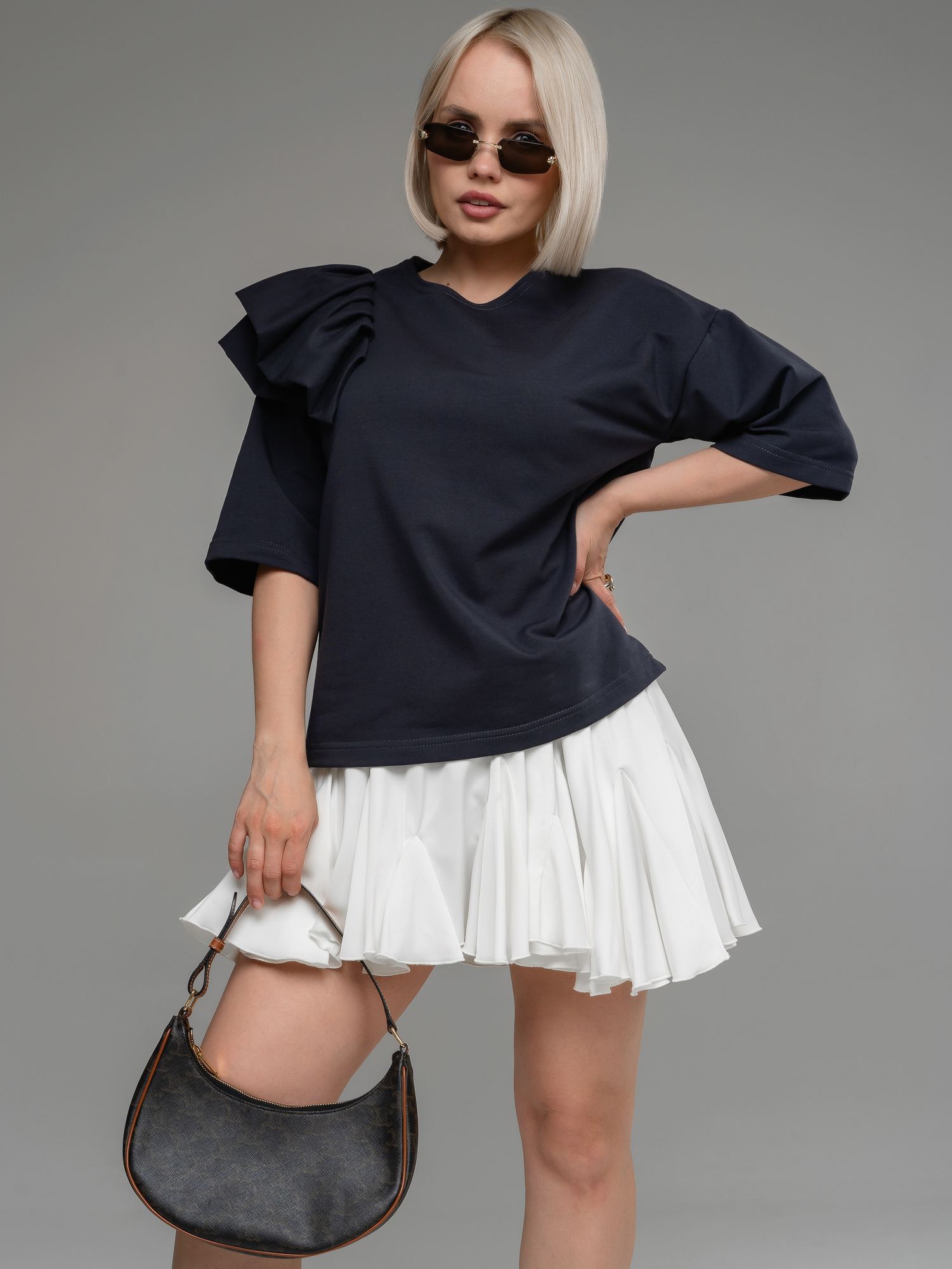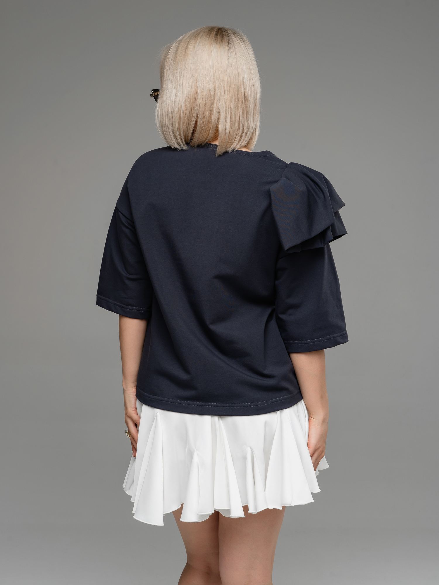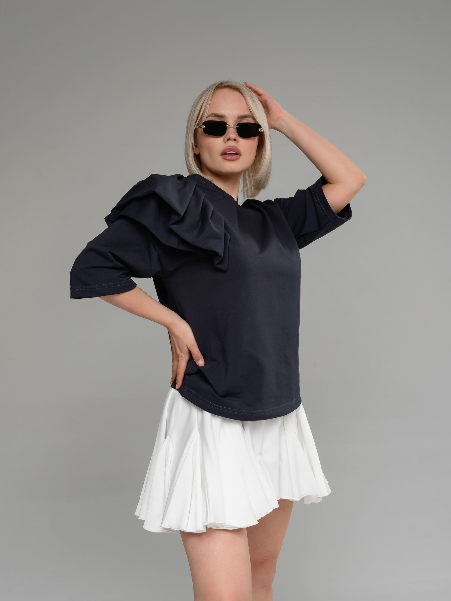 Футболка женская из футера антрацитового цвета в стиле Оверсайз , рукавами длиной до локтя и объемным воланом на плече . Высокое содержание хлопка в составе 92 % позволит почувствовать максимальный комфорт и уверенность в себе, а добавление эластана 8 % придаcт этому изделию дополнительную прочность и износостойкость. Оверсайз стиль, рукава длиной до локтя и объемный волан - сделают элегантным ваш образ. Вы будете выглядеть превосходно в любой ситуации - будь это повседневный или наряд или для праздничных и вечерних выходов. Свободная, удлиненная футболка идеальный вариант для летнего периода. Благодаря своей универсальности данную модель можно носить как футболку с рюшами или женскую блузку. Изделие выполнено из трикотажа премиального качества - ПЕНЬЕ, с содержанием хлопка более 92%