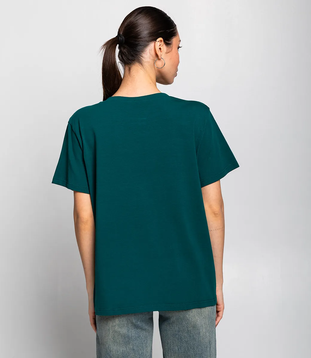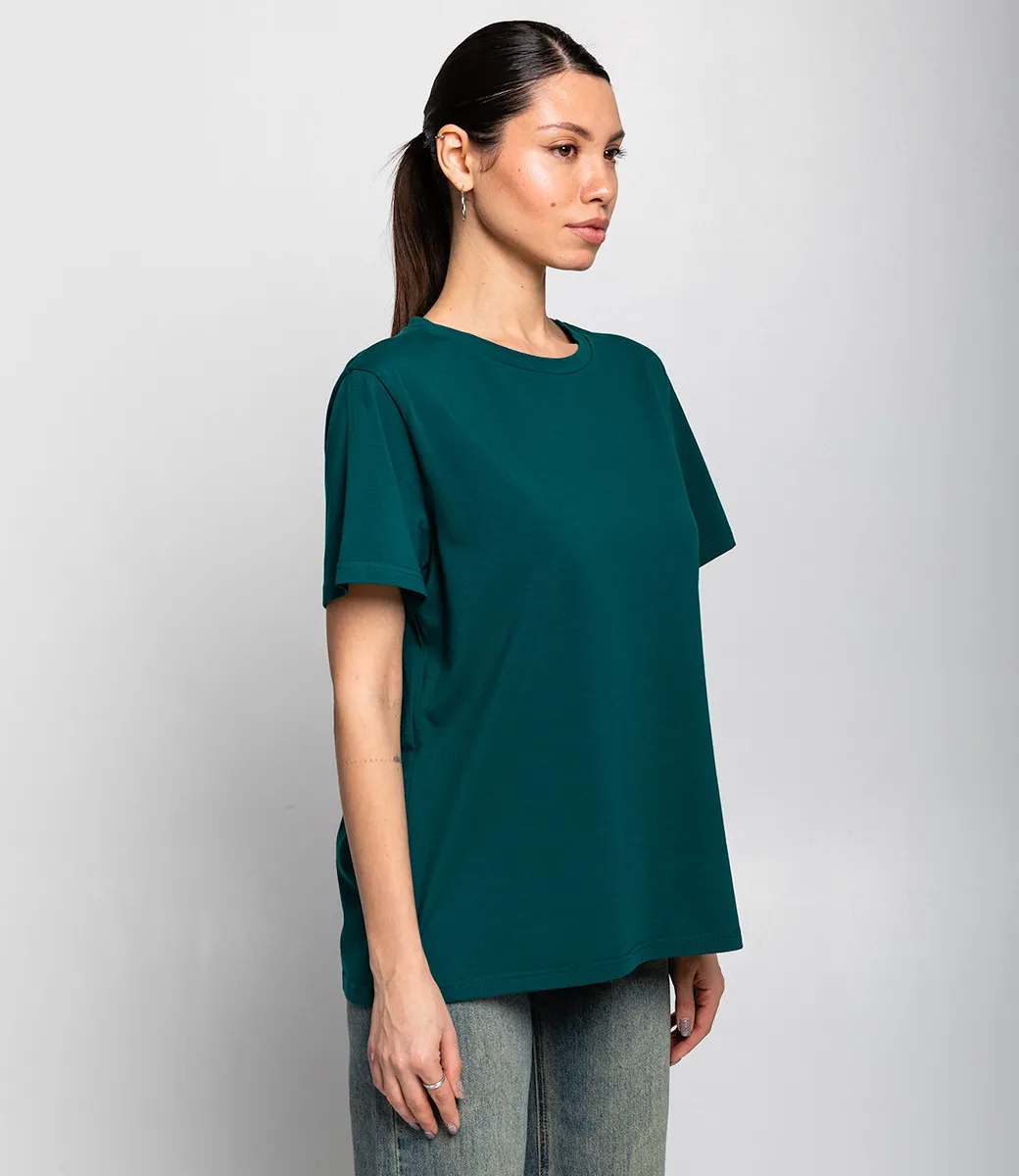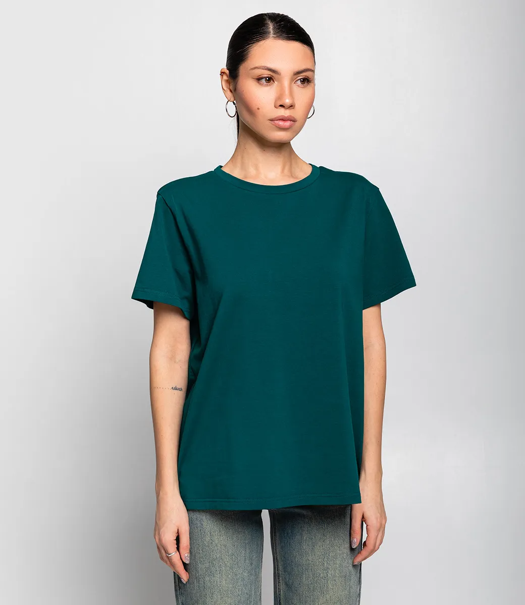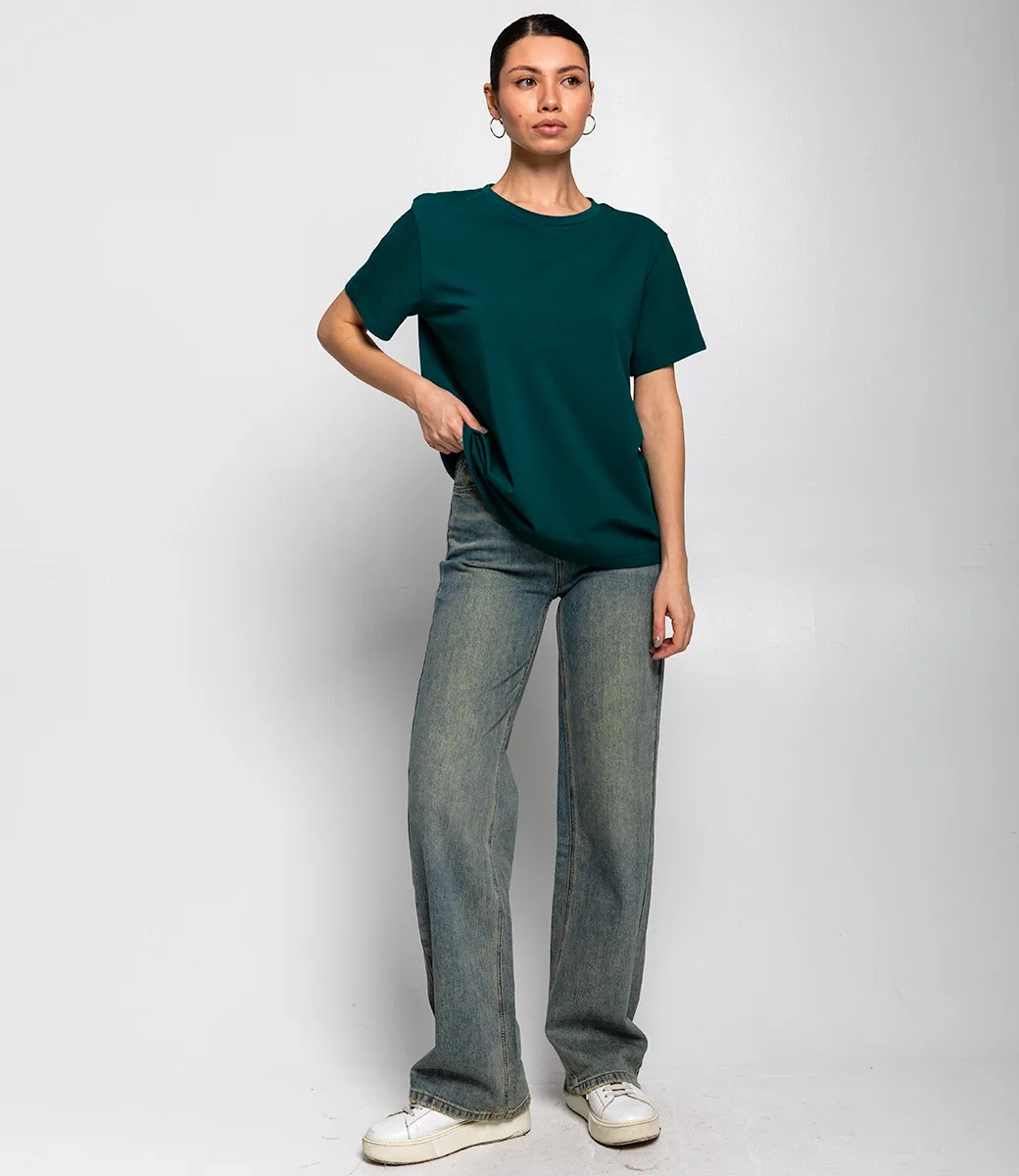 Базовая однотонная футболка с натуральным составом, идеальной длины. Универсальная модель прекрасно смотрится с джинсами, брюками, юбкой, также ее можно надевать в офис под пиджак или кардиган. Рост 164 см, 83-61-89.