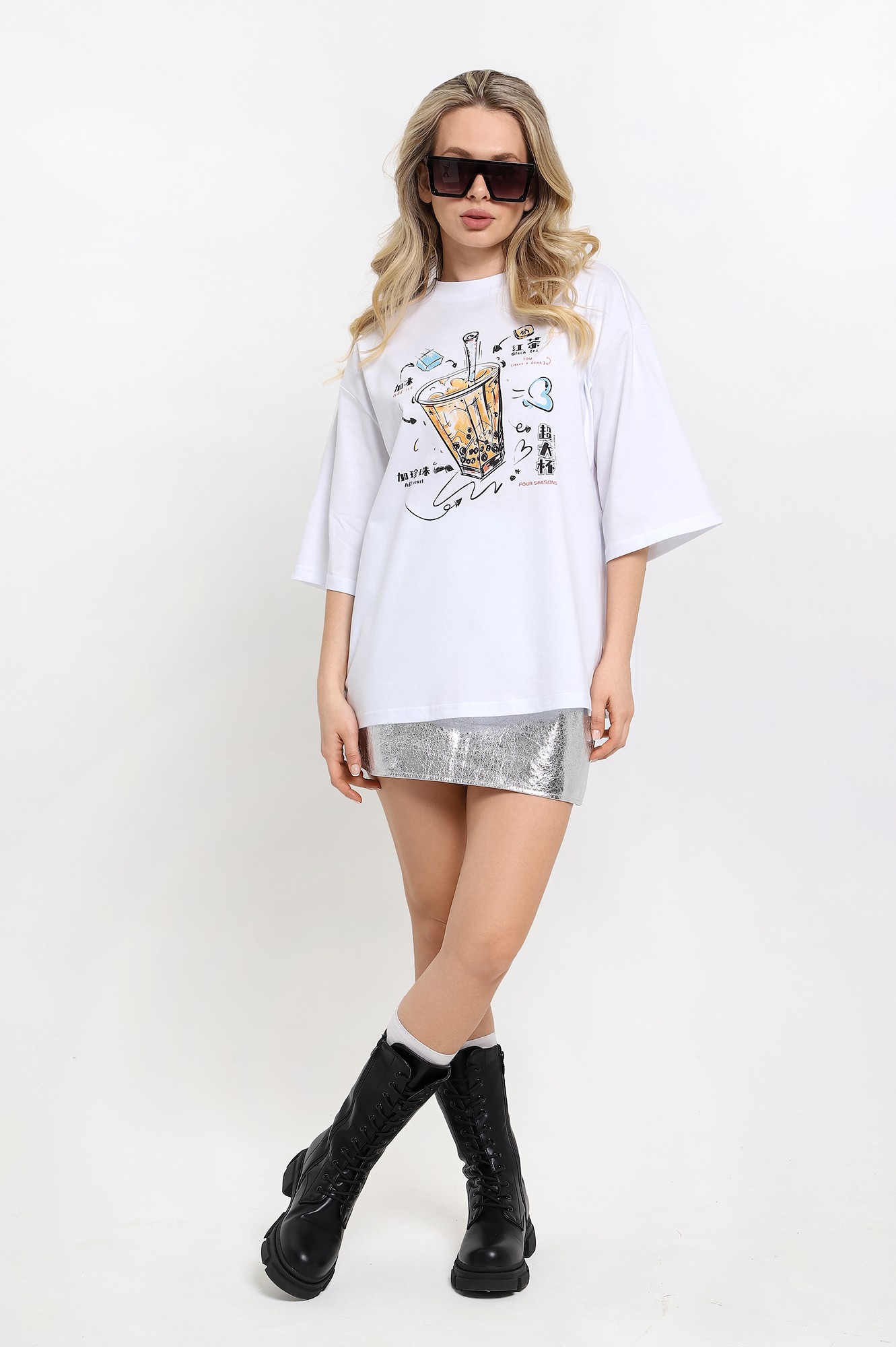 Футболка молодежная из гладкокрашеного свободного покроя оверсайз, с короткими втачными рукавами, спущенной линией плеча, горловиной овальной формы, обработанной широкой втачной планкой, и принтом на полочке, выполненным в технике «шелкографии».