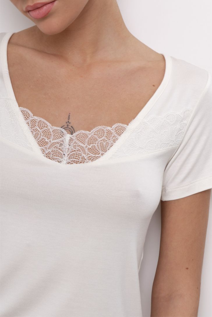 Футболка с короткими рукавами свободного прилегания. Вырез горловины декорирован нежным кружевом.