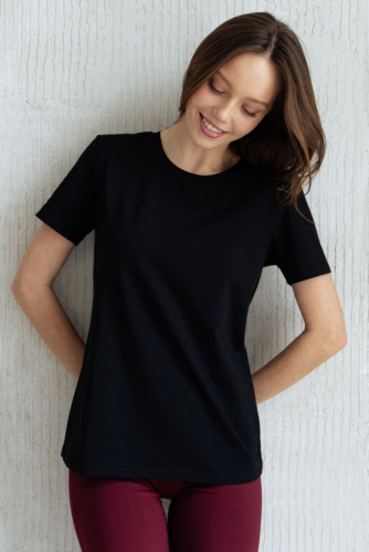 Футболка с короткими рукавами свободного прилегания. Вырез горловины декорирован нежным кружевом.