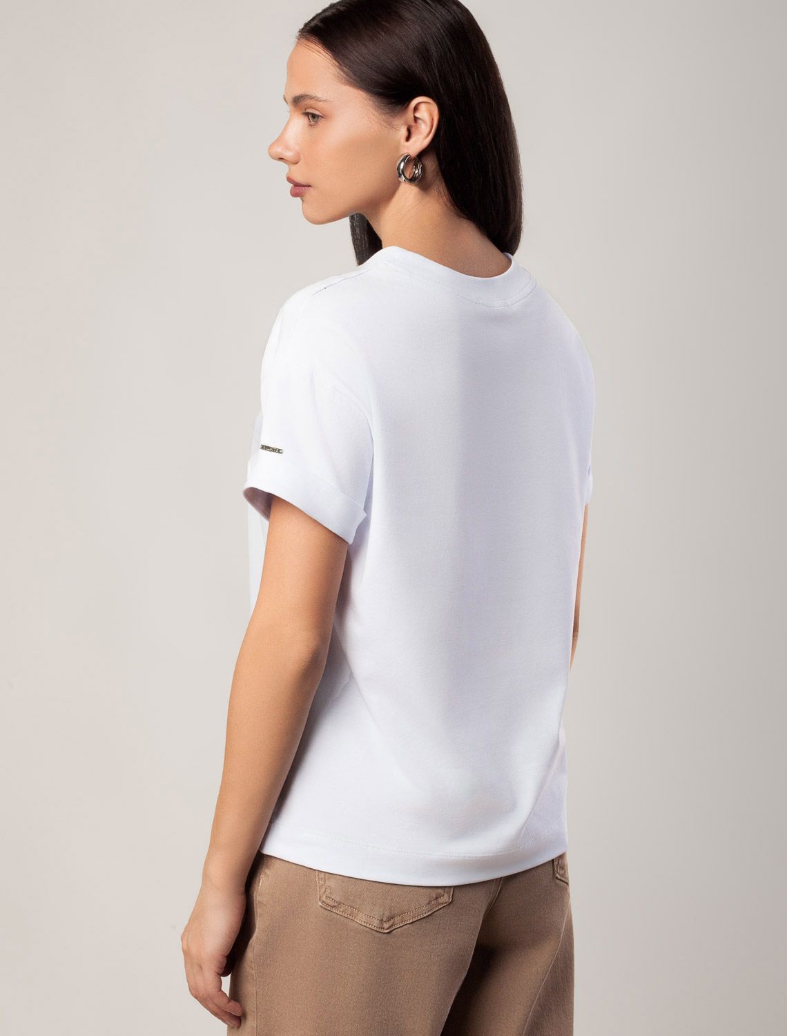 Базовая однотонная футболка из премиального хлопка. Горловина выполнена из рибаны в тон изделия, Рукава с подворотами и золотистым логотипом бренда. Добавление эластана в состав изделия способствует формоустойчивости. Самое высокое качество хлопковых волокон обеспечивает комфорт в любое время года. Идеально держит форму и сохраняет внешний вид в течение долговременного использования. Универсальная базовая вещь для ваших стилистических решений.