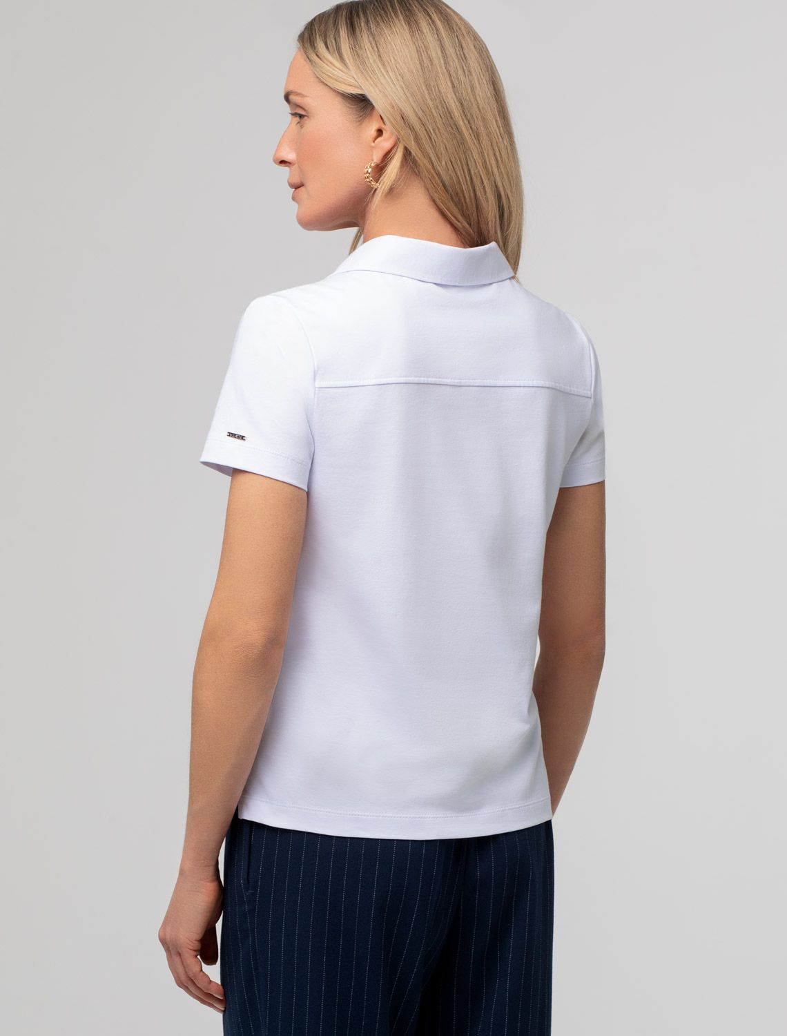 Футболка-поло выполнена из премиального хлопка. Модель украшена золотистыми пуговицами и вышитым логотипом бренда. Успешная классика на все времена. За счет эластана в составе, идеально держит форму и сохраняет внешний вид в течение договременного использования. Унивесально сочетается как с костюмными низами в деловом стиле, так и с джинсами в повседневном образе.