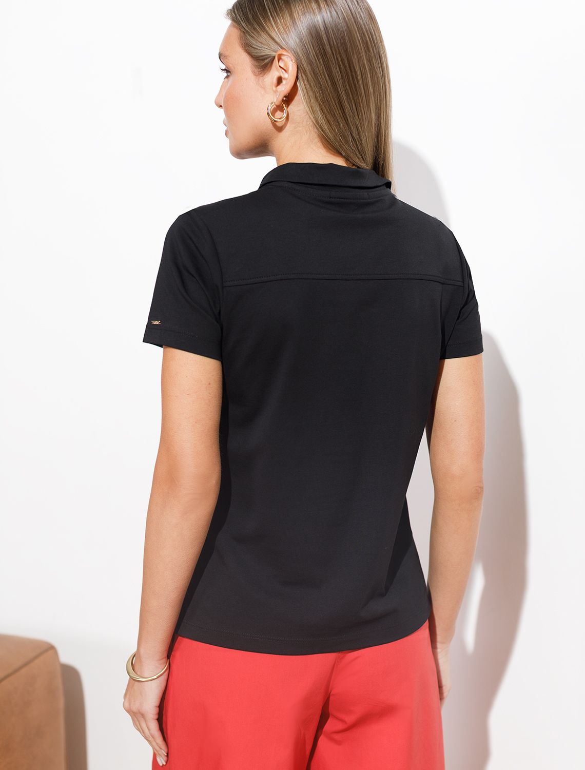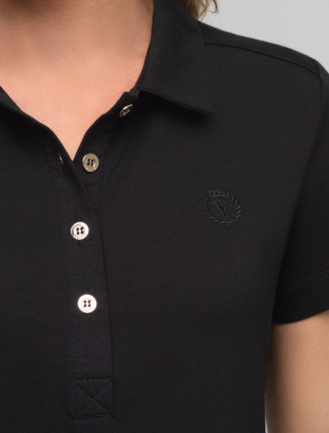 Футболка-поло выполнена из премиального хлопка. Модель украшена золотистыми пуговицами и вышитым логотипом бренда. Успешная классика на все времена. За счет эластана в составе, идеально держит форму и сохраняет внешний вид в течение договременного использования. Унивесально сочетается как с костюмными низами в деловом стиле, так и с джинсами в повседневном образе.