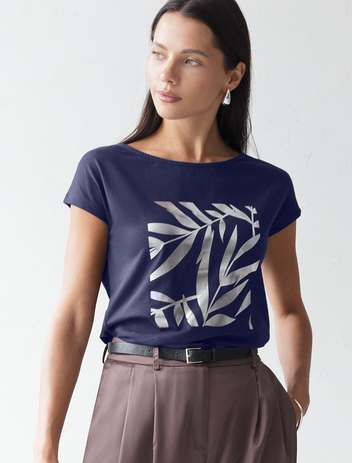Футболка темно-синего цвета идеально подходит для вечеринки и создания яркого образа. Оригинальный блестящий принт из фольги серебристого цвета в виде листиков придает изделию шикарный вид, который привлечет внимание на любом мероприятии. Модель с вырезом лодочка и цельнокроеным коротким рукавом обеспечивает свободу движений и комфорт в носке. Такой фасон изделия подходит на большие размеры, гармонично сидит на фигуре и помогает создать легкий акцент на достоинствах. Аккуратный вырез лодочка красиво подчеркивает шею и делает образ элегантным, сохраняя актуальность для разных случаев — от рабочих встреч до вечерних прогулок и праздничных мероприятий.