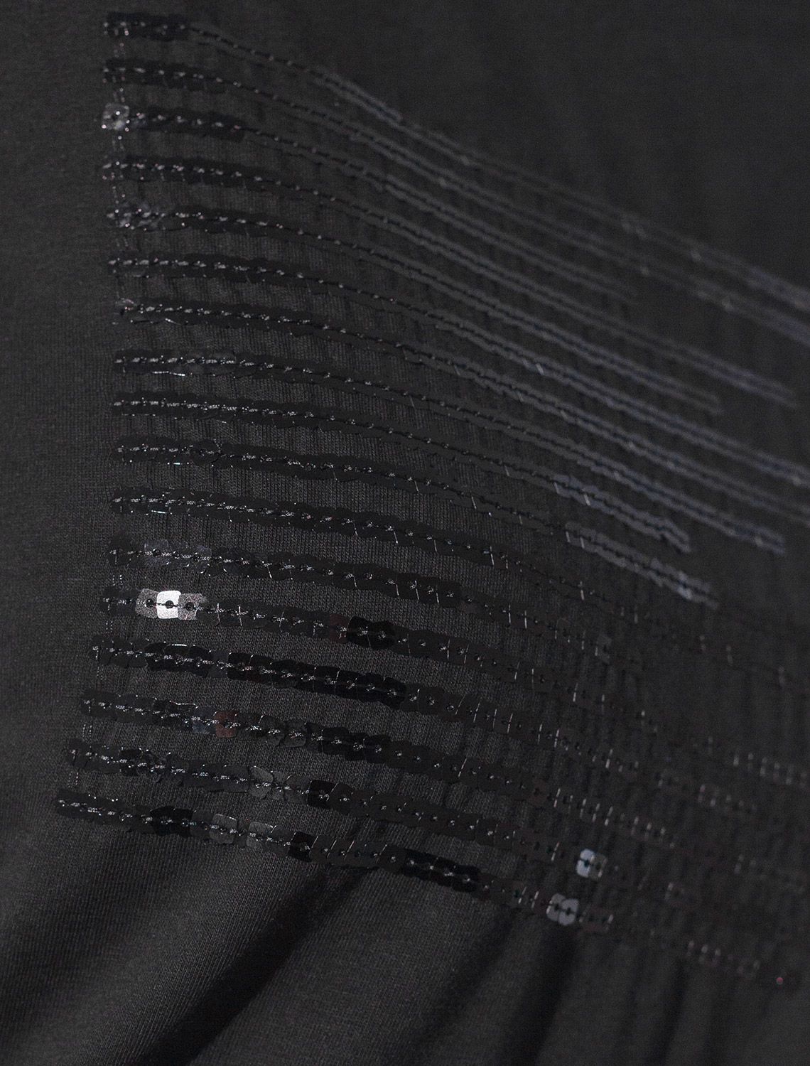 Футболка черного цвета идеально подходит для вечеринки и создания яркого образа. Оригинальный принт из пайеток придает изделию шикарный вид, который привлечет внимание на любом мероприятии. Модель с круглым вырезом и классическим коротким рукавом обеспечивает свободу движений и комфорт в носке. Такой фасон изделия подходит на большие размеры, гармонично сидит на фигуре и помогает создать легкий акцент на достоинствах. Аккуратный круглый вырез красиво подчеркивает шею и делает образ элегантным, сохраняя актуальность для разных случаев — от рабочих встреч до вечерних прогулок и праздничных мероприятий.