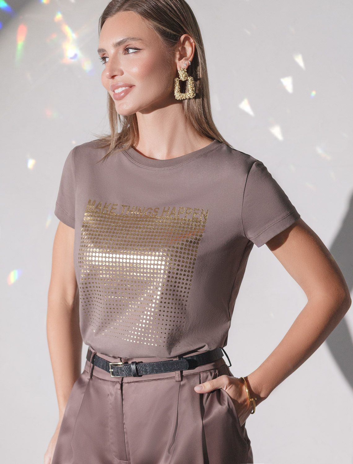 Футболка кофейного цвета идеально подходит для вечеринки и создания яркого образа. Оригинальный принт из фольги золотистого цвета придает изделию шикарный вид, который привлечет внимание на любом мероприятии. Модель с круглым вырезом и классическим коротким рукавом обеспечивает свободу движений и комфорт в носке. Такой фасон изделия подходит на большие размеры, гармонично сидит на фигуре и помогает создать легкий акцент на достоинствах. Аккуратный круглый вырез красиво подчеркивает шею и делает образ элегантным, сохраняя актуальность для разных случаев — от рабочих встреч до вечерних прогулок и праздничных мероприятий.