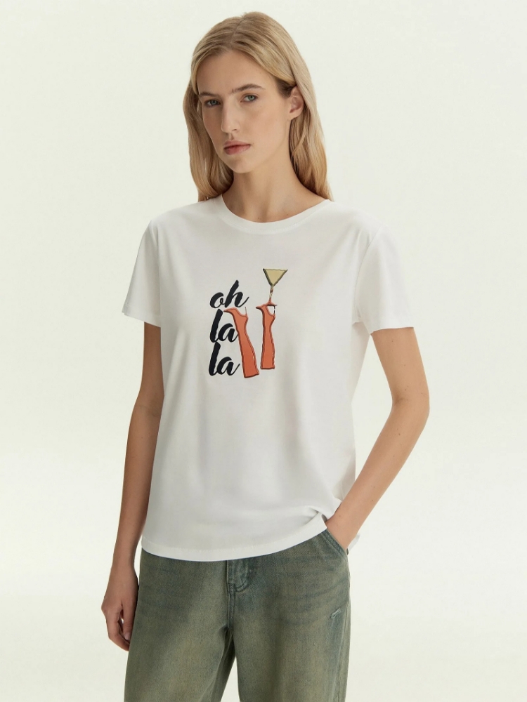 Хлопковая футболка в белом цвете с заводным принтом — для нескучных образов. Подойдёт для офиса в пятницу и выходных, для бранчей и вечеринок, дел и отдыха. Модель прямого силуэта с круглым вырезом станет основой множества образов. Длина позволяет носить футболку как навыпуск, так и в заправленном виде