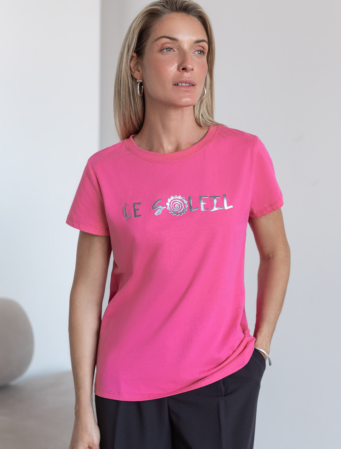 Футболка прямого кроя выполнена из 100% хлопка. Базовая модель дополнена лаконичным авторским принтом. Легко впишется в повседневный гардероб. Изделие хорошо держит форму и обеспечивает комфортный микроклимат в течение дня. Перевод надписи на принте: "le soleil (фр.) - солнце" розовая фуксия_le_soleil