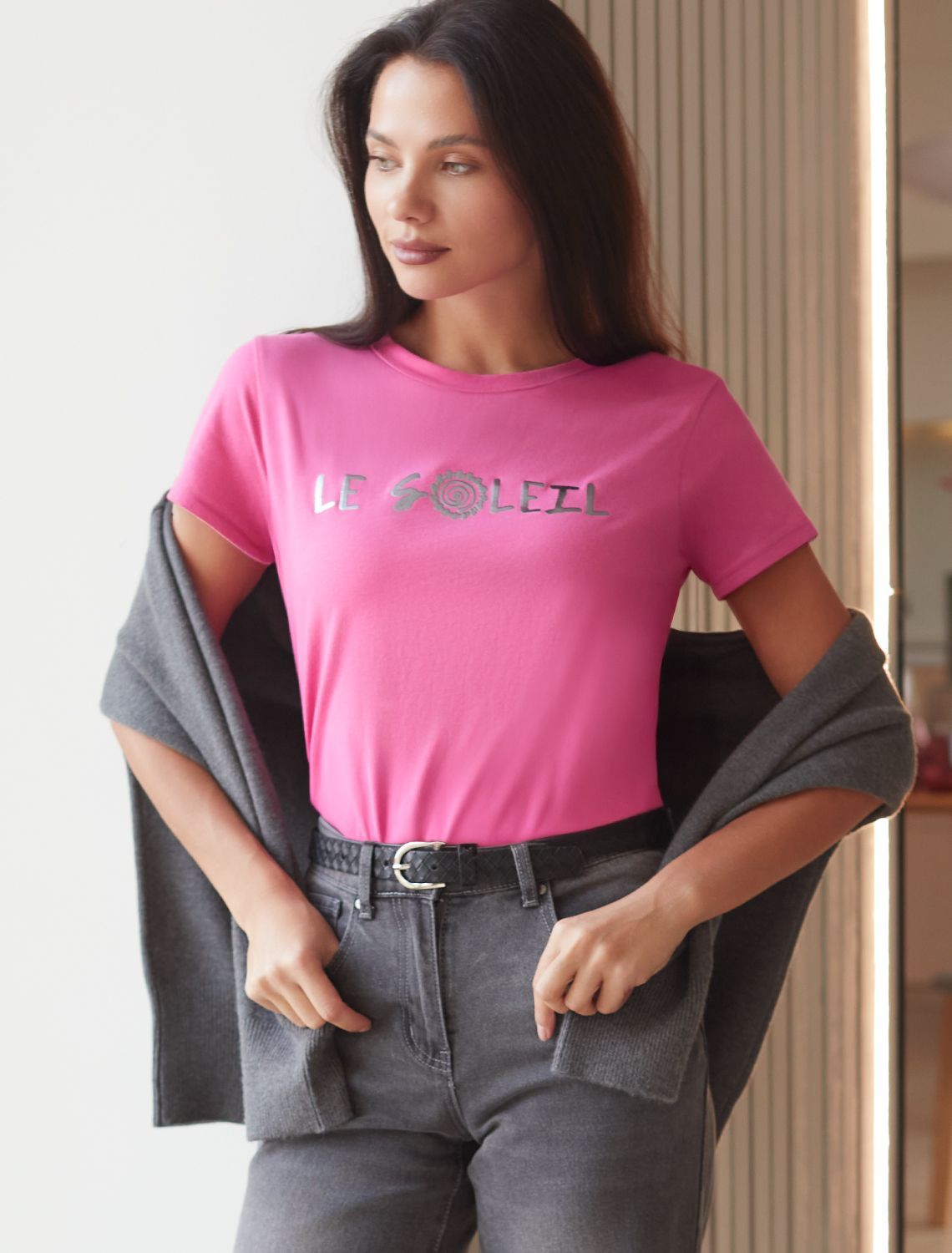 Футболка прямого кроя выполнена из 100% хлопка. Базовая модель дополнена лаконичным авторским принтом. Легко впишется в повседневный гардероб. Изделие хорошо держит форму и обеспечивает комфортный микроклимат в течение дня. Перевод надписи на принте: "le soleil (фр.) - солнце"