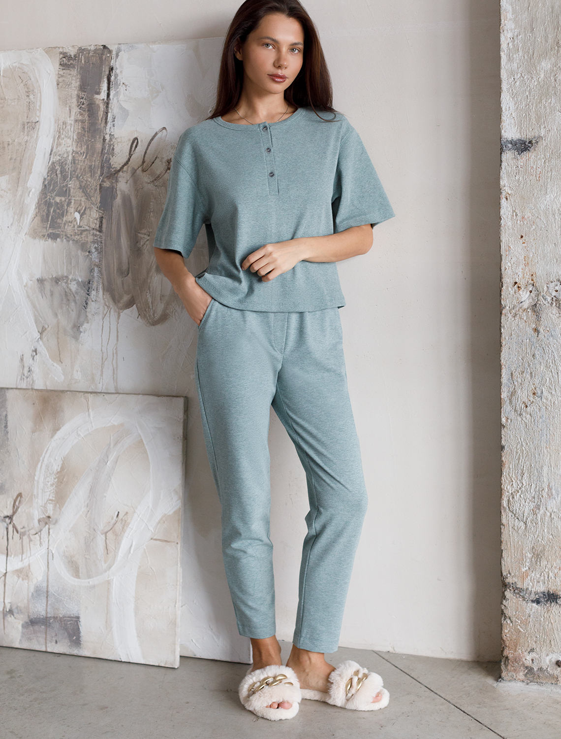 Футболка выполнена из фактурного трикотажа в рубчик. Модель свободного кроя дополнена пуговицами с логотипом бренда. Благодаря мягкой хлопковой ткани в рубчик, футболка очень приятная к телу. Эластан в составе гарантирует комфорт и формоустойчивость изделия. Сочетается в костюме с шортами D48.007 и брюками D44.121 оливковый меланж