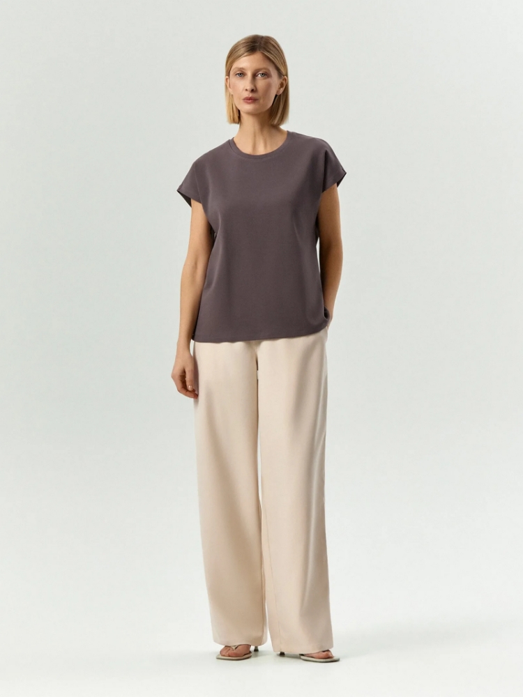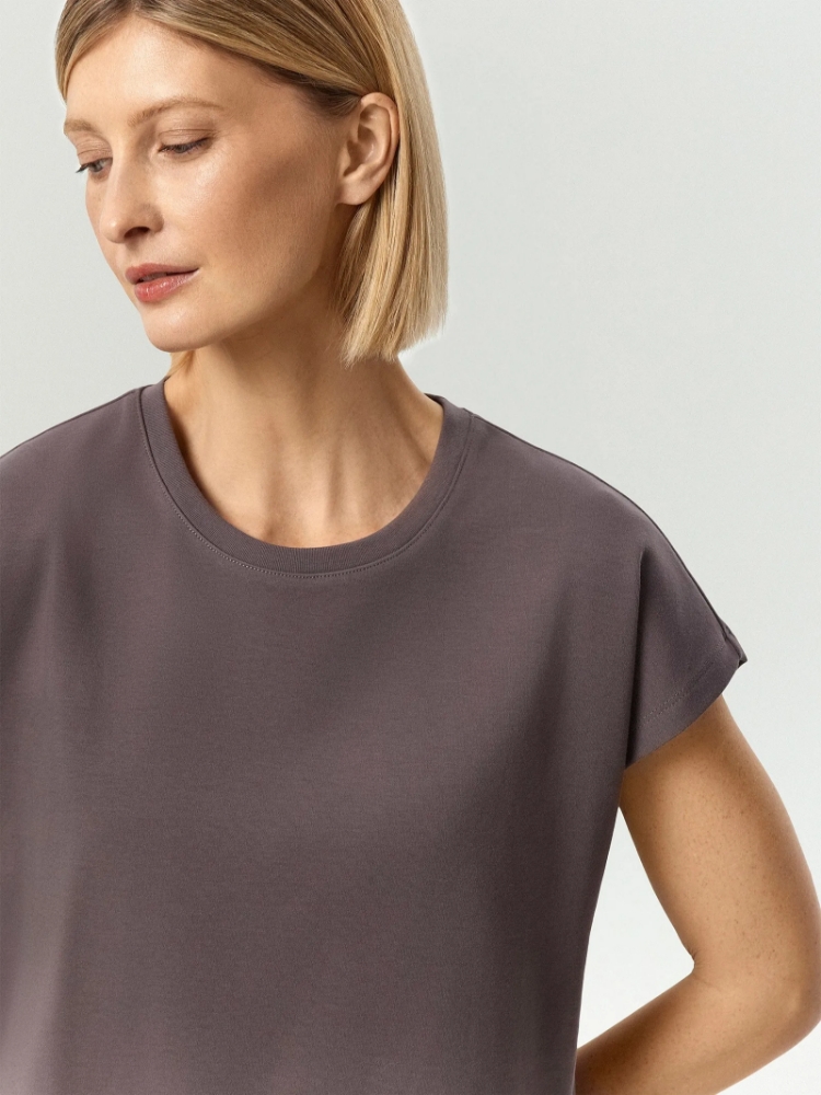 Базовая футболка в цвете графита для концептуальных и простых образов. Модель без рукавов со спущенным плечом удобно носить под жакет: ничего не собирается складками и не мешает. Выполнена из хлопка с небольшим добавлением эластана для лучшей посадки