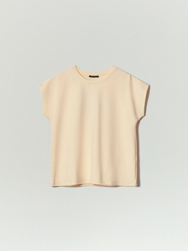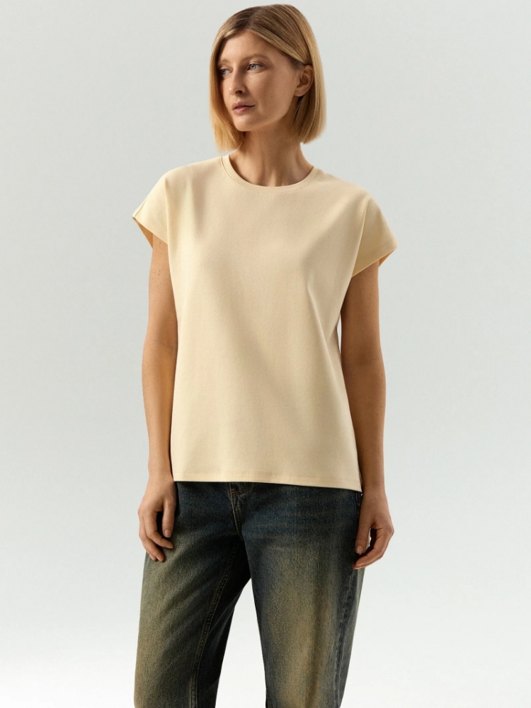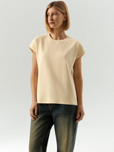 Базовая футболка в трендовом цвете сливочного масла для концептуальных и простых образов. Модель без рукавов со спущенным плечом удобно носить под жакет: ничего не собирается складками и не мешает. Выполнена из хлопка с небольшим добавлением эластана для лучшей посадки