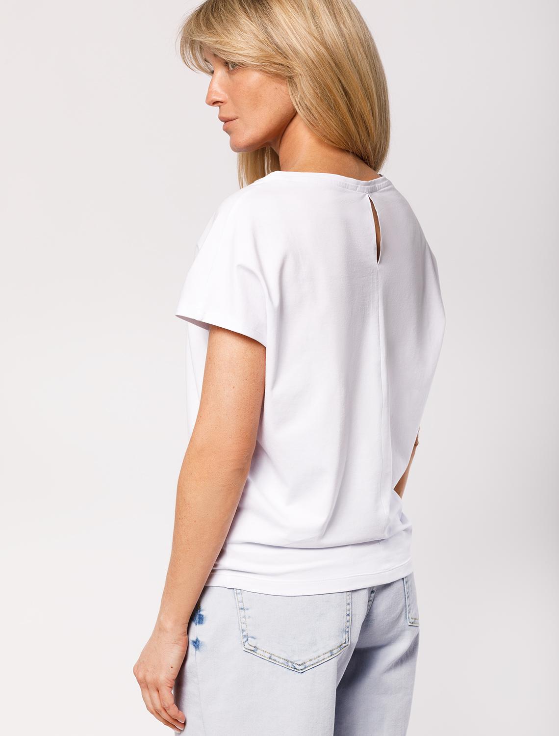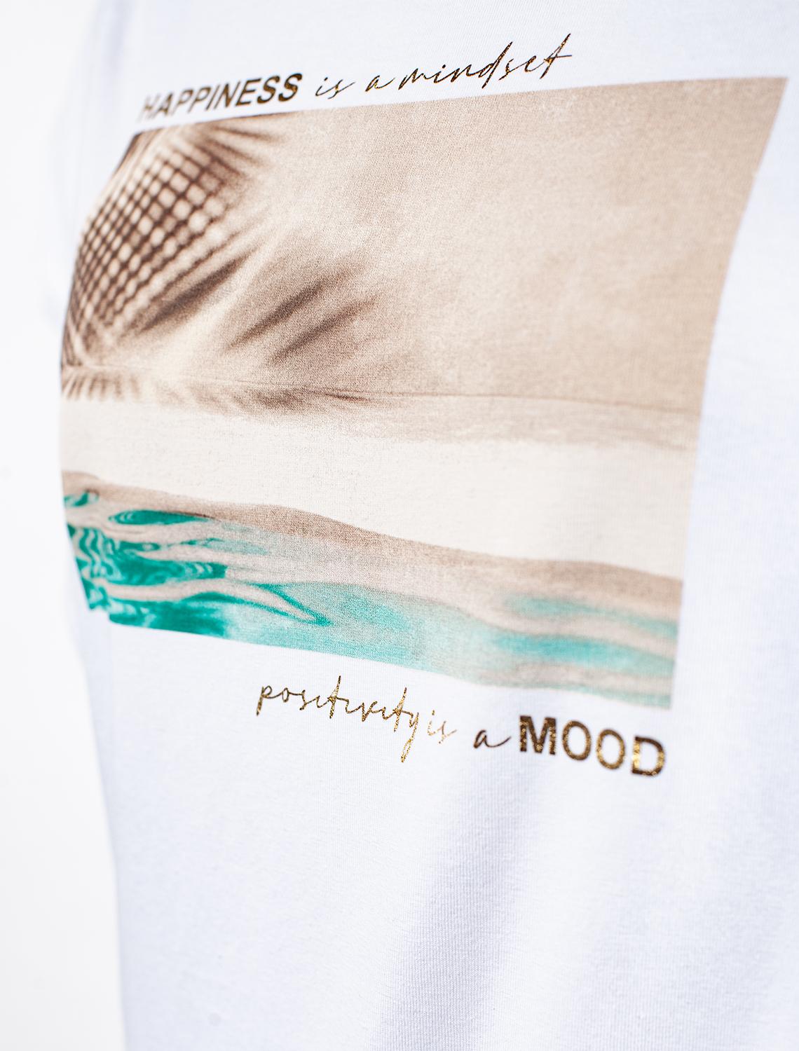 Футболка с цельнокроеным рукавом выполнена из премиального хлопка с эластаном. Авторский принт нанесен водными красками с устойчивым покрытием. Изделие отлично держит форму, почти не мнется и комфортно сидит по фигуре. Отдельным украшением служит металлический логотип бренда. белый_mood